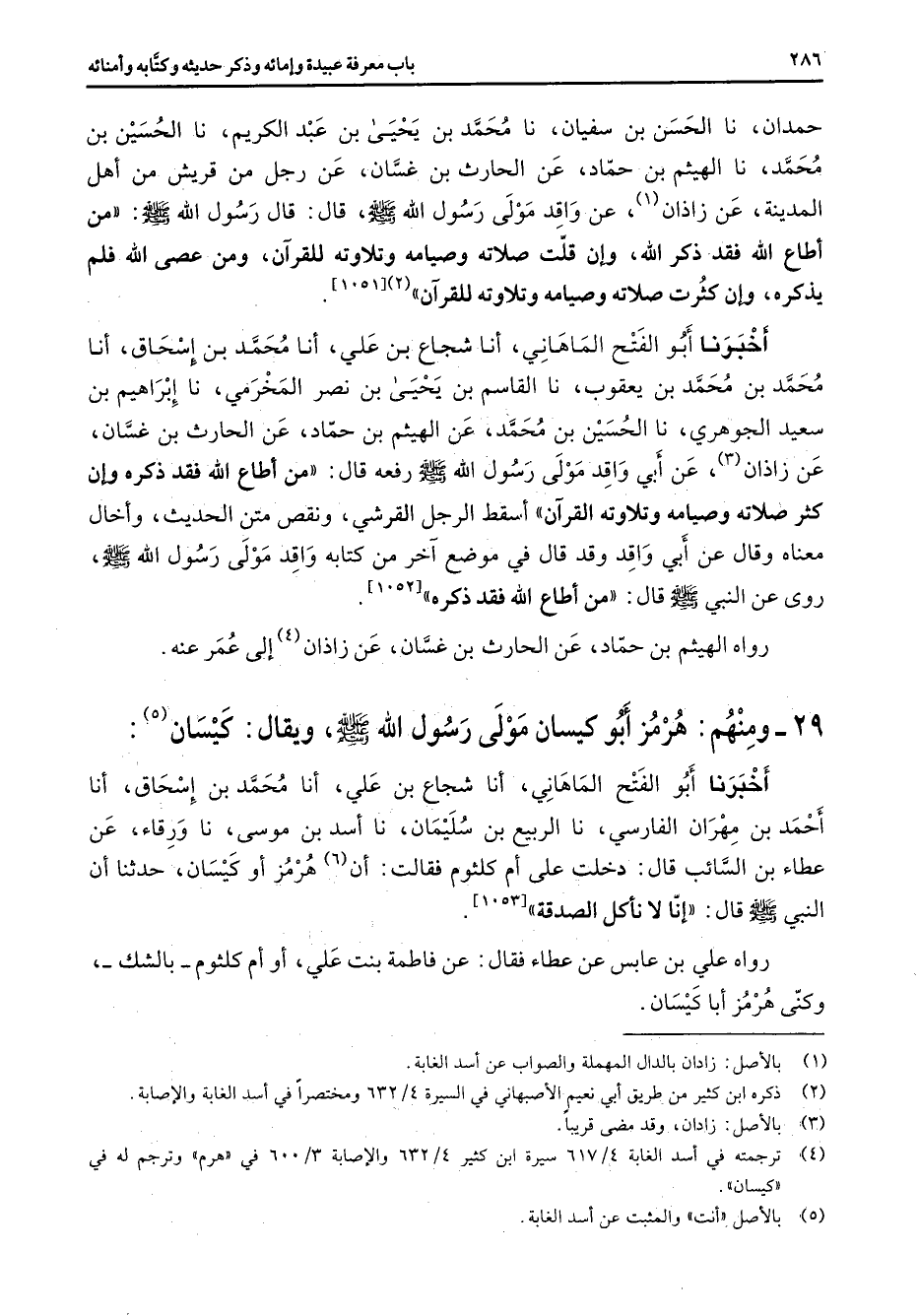 [1051] أخبرنا أبو الفتح الماهاني أنا شجاع بن علي أنا محمد بن إسحاق أنا محمد بن محمد بن يعقوب نا القاسم بن يحيى بن نصر المخرمي نا إبراهيم بن سعيد الجوهري نا الحسين بن محمد عن الهيثم بن حماد عن الحارث بن غسان عن زاذان (3) عن أبي واقد مولى رسول الله (صلى الله عليه وسلم) رفعه قال من أطاع الله فقد ذكره وإن كثر صلاته وصيامه وتلاوته القرآن أسقط الرجل القرشي ونقص متن الحديث وأخال معناه وقال عن أبي واقد وقد قال في موضع آخر من كتابه واقد مولى رسول الله (صلى الله عليه وسلم) روى عن النبي (صلى الله عليه وسلم) قال من أطاع الله فقد ذكره