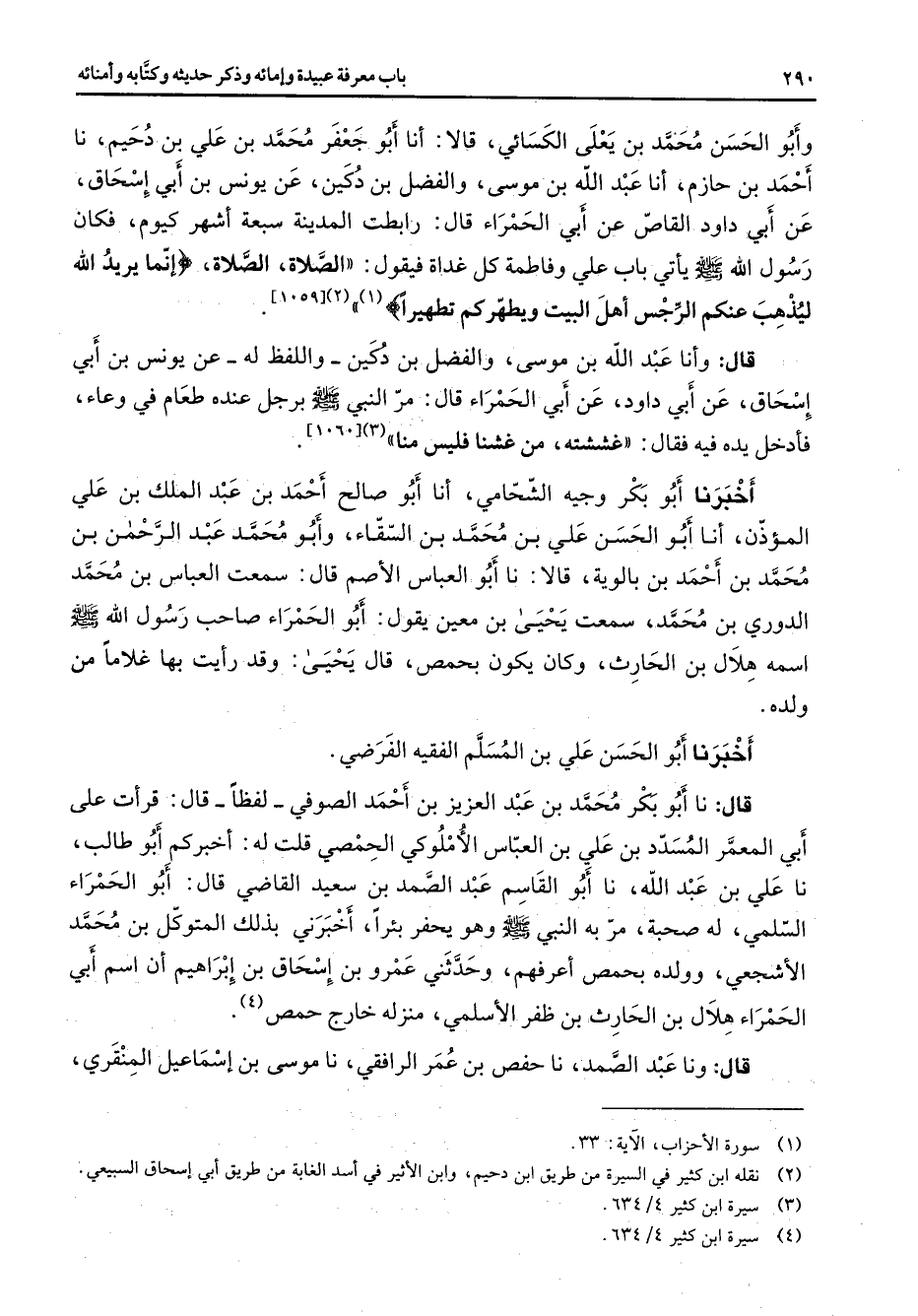 وأبو الحسن محمد بن يعلى الكسائي قالا أنا أبو جعفر محمد بن علي بن دحيم نا أحمد بن حازم أنا عبد الله بن موسى والفضل بن دكين عن يونس بن أبي إسحاق عن أبي داود القاص عن ابي الحمراء قال رابطت المدينة سبعة اشهر كيوم فكان رسول الله (صلى الله عليه وسلم) يأتي باب علي وفاطمة كل غداة فيقول الصلاة الصلاة " إنما يريد الله ليذهب عنكم الرجس أهل البيت ويطهركم تطهيرا " (1) (2)