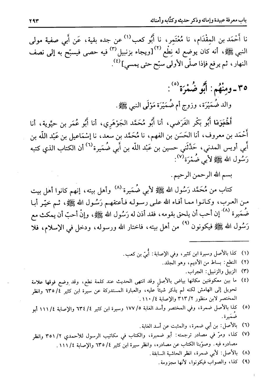 نا أحمد بن المقدام نا معتمر نا أبو كعب (1) عن جده بقية عن أبي صفية مولى النبي (صلى الله عليه وسلم) أنه كان يوضع له نطع (2) ويجاء بزنبيل (3) فيه حصى فيسبح به إلى نصف النهار ثم يرفع فإذا صلى الأولى سبح حتى يمسي (4) 35 ومنهم أبو ضمرة (5) والد ضميرة وزوج أم ضميرة مولى النبي (صلى الله عليه وسلم) اخبرنا أبو بكر الفرضي أنا أبو محمد الجوهري أنا أبو عمر بن حيوية أنا أحمد بن معروف أنا الحسن بن الفهم نا محمد بن سعد نا إسماعيل بن عبد الله بن أبي أويس المدني حدثني حسين بن عبد الله بن أبي ضميرة أن الكتاب الذي كتبه رسول الله (صلى الله عليه وسلم) لأبي ضمرة (7) بسم الله الرحمن الرحيم كتاب محمد رسول الله (صلى الله عليه وسلم) لأبي ضميرة (8) وأهل بيته وإنهم كانوا أهل بيت من العرب وكانوا مما أفاء الله على رسوله فأعتقهم رسول الله (صلى الله عليه وسلم) ثم خير أبا ضميرة إن أحب أن يلحق بقومه فقد أذن له رسول الله (صلى الله عليه وسلم) وإن أحب أن يمكث مع رسول الله (صلى الله عليه وسلم) فيكونون (9) من أهل بيته فاختار الله ورسوله ودخل في الإسلام فلا