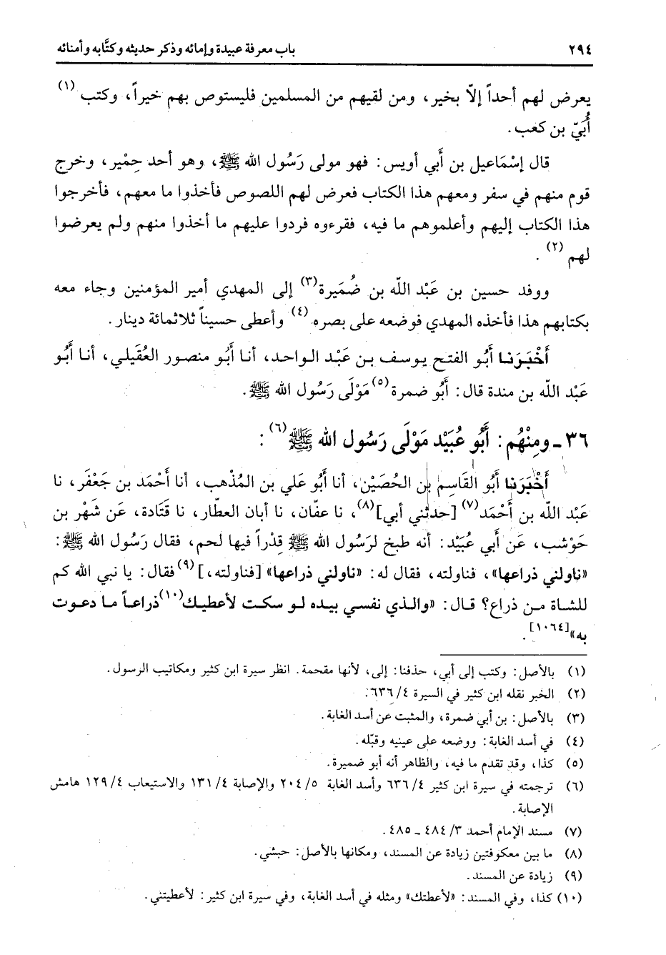 يعرض لهم أحدا إلا بخير ومن لقيهم من المسلمين فليستوص بهم خيرا وكتب (1) أبي بن كعب قال إسماعيل بن أبي أويس فهو مولى رسول الله (صلى الله عليه وسلم) وهو أحد حمير وخرج قوم منهم في سفر ومعهم هذا الكتاب فعرض لهم اللصوص فأخذوا ما معهم فأخرجوا هذا الكتاب إليهم وأعلموهم ما فيه فقرءوه فردوا عليهم ما أخذوا منهم ولم يعرضوا لهم (2) ووفد حسين بن عبد الله بن ضميرة (3) إلى المهدي أمير المؤمنين وجاء معه بكتابهم هذا فأخذه المهدي فوضعه على بصره (4) وأعطى حسينا ثلاثمائة دينار أخبرنا أبو الفتح يوسف بن عبد الواحد أنا أبو منصور العقيلي أنا أبو عبد الله بن مندة قال أبو ضمرة (5) مولى رسول الله (صلى الله عليه وسلم) 36 ومنهم أبو عبيد مولى رسول الله (صلى الله عليه وسلم) (6) أخبرنا أبو القاسم بن الحصين أنا أبو علي بن المذهب أنا أحمد بن جعفر نا عبد الله بن احمد (7) حدثني أبي (8) نا عفان نا ابان العطار نا قتادة عن شهر بن حوشب عن أبي عبيد أنه طبخ لرسول الله (صلى الله عليه وسلم) قدرا فيها لحم فقال رسول الله (صلى الله عليه وسلم) ناولني ذراعها فناولته فقال له ناولني ذراعها فناولته (9) فقال يا نبي الله كم للشاة من ذراع قال والذي نفسي بيده لو سكت لأعطيك ذراعا ما دعوت به