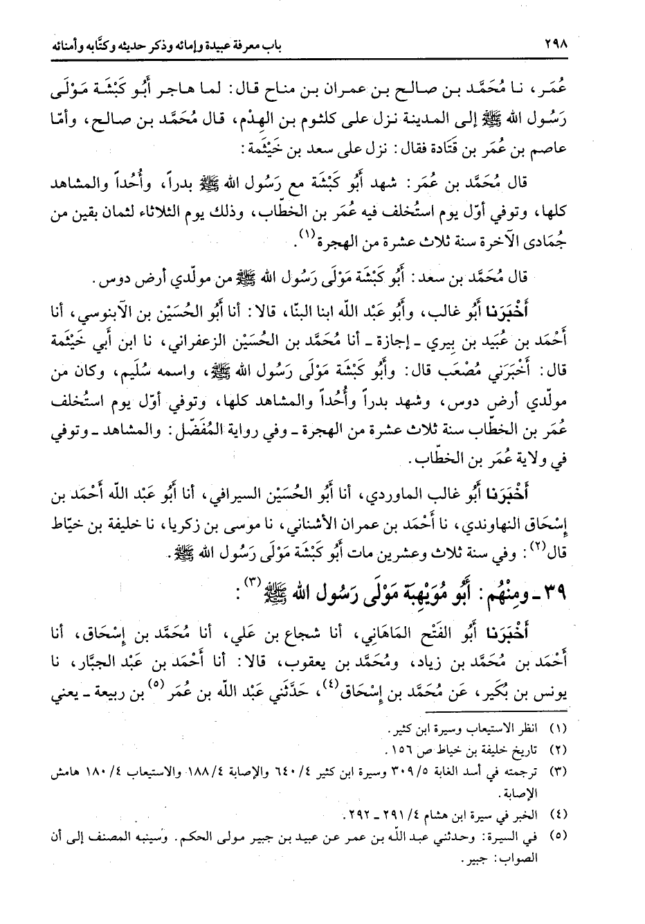 عمر نا محمد بن صالح بن عمران بن مناح قال لما هاجر أبو كبشة مولى رسول الله (صلى الله عليه وسلم) إلى المدينة نزل على كلثوم بن الهدم قال محمد بن صالح وأما عاصم بن عمر بن قتادة فقال نزل على سعد بن خيثمة قال محمد بن عمر شهد أبو كبشة مع رسول الله (صلى الله عليه وسلم) بدرا وأحدا والمشاهد كلها وتوفي أول يوم استخلف فيه عمر بن الخطاب وذلك يوم الثلاثاء لثمان بقين من جمادى الآخرة سنة ثلاث عشرة من الهجرة (1) قال محمد بن سعد وأبو كبشة مولى رسول الله (صلى الله عليه وسلم) من مولدي أرض دوس أخبرنا أبو غالب وأبو عبد الله ابنا البنا قالا أنا أبو الحسين بن الآبنوسي أنا أحمد بن عبيد بن بيري إجازة أنا محمد بن الحسين الزعفراني نا ابن خيثمة قال أخبرني مصعب قال وأبو كبشة مولى رسول الله (صلى الله عليه وسلم) واسمه سليم وكان من مولدي أرض دوس وشهد بدرا وأحدا والمشاهد كلها وتوفي أول يوم استخلف عمر بن الخطاب سنة ثلاث عشرة من الهجرة وفي رواية المفضل والمشاهد وتوفي في ولاية عمر بن الخطاب أخبرنا أبو غالب الماوردي أنا أبو الحسين السيرافي أنا أبو عبد الله أحمد بن إسحاق النهاوندي نا أحمد بن عمران الأشناني نا موسى بن زكريا نا خليفة بن خياط قال (2) وفي سنة ثلاث وعشرين مات أبو كبشة مولى رسول الله (صلى الله عليه وسلم) 39 ومنهم أبو مويهبة مولى رسول الله (صلى الله عليه وسلم) (3) أخبرنا أبو الفتح الماهاني أنا شجاع بن علي أنا محمد بن إسحاق أنا احمد بن محمد بن زياد ومحمد بن يعقوب قالا أنا أحمد بن عبد الجبار نا يونس بن بكير عن محمد بن إسحاق (4) حدثني عبد الله بن عمر (5) بن ربيعة يعني