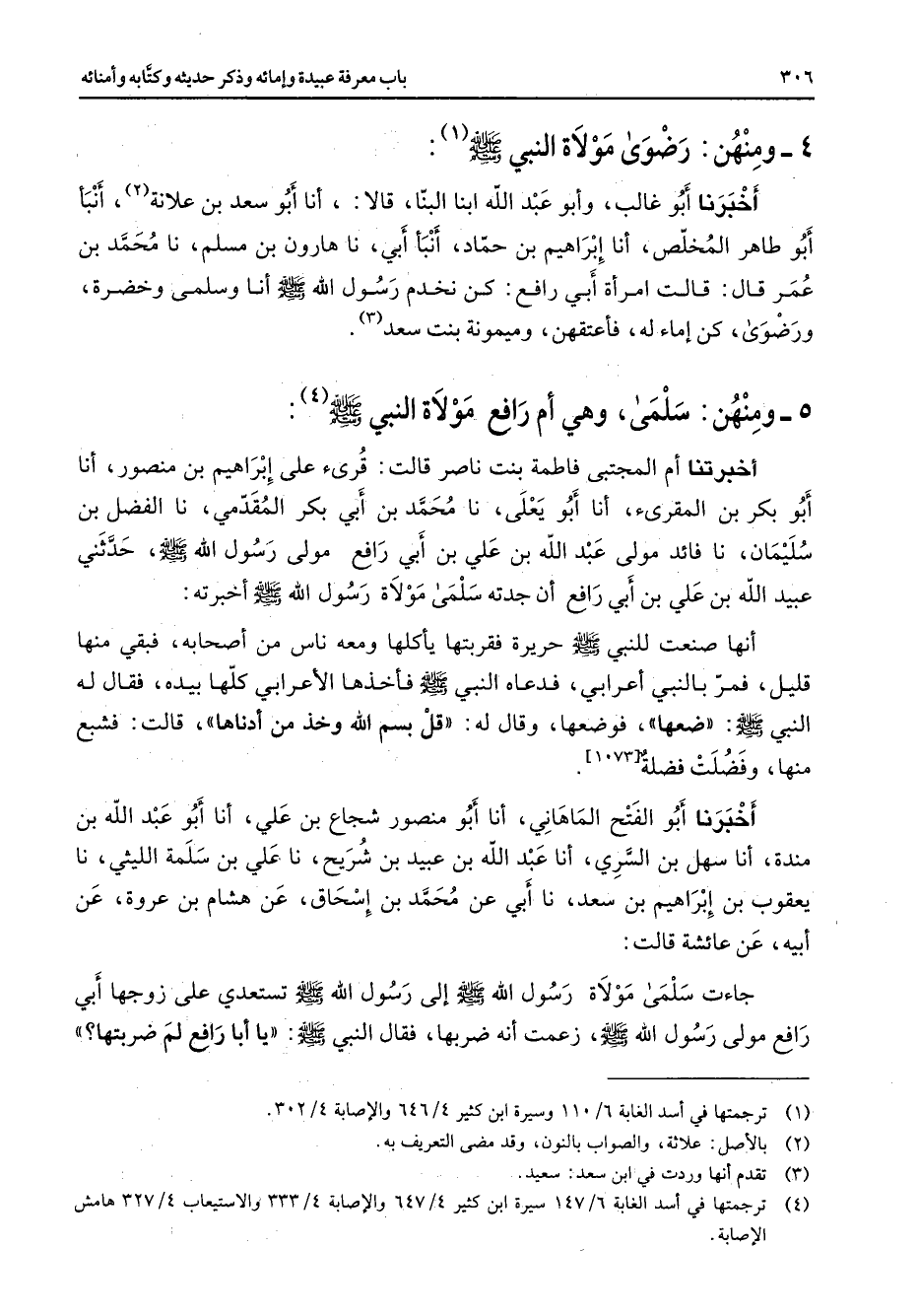 4 - ومنهن رضوى مولاة النبي (صلى الله عليه وسلم) (1) أخبرنا أبو غالب وأبو عبد الله ابنا البنا قالا أنا أبو سعد بن علانة (2) أنبأ أبو طاهر المخلص أنا إبراهيم بن حماد أنبأنا أبي نا هارون بن مسلم نا محمد بن عمر قال قالت امرأة أبي رافع كن نخدم رسول الله (صلى الله عليه وسلم) أنا وسلمى وخضرة ورضوى كن إماء له فأعتقهن وميمونة بنت سعد (3)