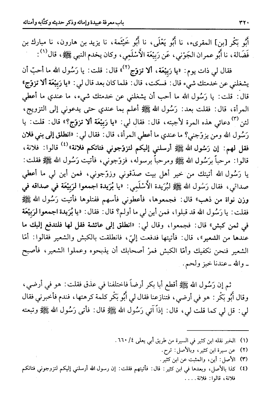 أبو بكر بن المقرئ نا أبو يعلى نا أبو خيثمة نا يزيد بن هارون نا مبارك بن فضالة نا أبو عمران الجوني عن ربيعة الأسلمي وكان يخدم النبي (صلى الله عليه وسلم) قال (1) فقال لي ذات يوم يا ربيعة ألا تزوج (2) قال قلت يا رسول الله ما أحب أن يشغلني عن خدمتك شئ قال فسكت قال فلما كان بعد قال لي يا ربيعة ألا تزوج قال قلت يا رسول الله ما أحب أن يشغلني عن خدمتك شئ ما عندي ما أعطي المرأة قال فقلت بعد رسول الله (صلى الله عليه وسلم) أعلم بما عندي حتى يدعوني إلى التزويج لئن (3) دعائي هذه المرة لأجبته قال فقال لي يا ربيعة ألا تزوج قال قلت يا رسول الله ومن يزوجني ما عندي ما إعطي المرأة قال فقال لي انطلق إلى بني فلان فقل لهم إن رسول الله (صلى الله عليه وسلم) أرسلني إليكم لتزوجوني فتاتكم فلانة (4) قالوا فلانة قالوا مرحبا برسول الله (صلى الله عليه وسلم) ومرحبا بروسوله فزوجوني فأتيت رسول الله (صلى الله عليه وسلم) فقلت يا رسول الله أتيتك من خير أهل بيت صدقوني وزوجوني فمن أين لي ما أعطي صداقي فقال رسول الله (صلى الله عليه وسلم) لبريدة الأسلمي يا بريدة اجمعوا لربيعة في صداقه في وزن نواة من ذهب قال فجمعوها فأعطوني فأسهم ففتلوها فأتيت رسول الله (صلى الله عليه وسلم) فقلت يا رسول الله قد قبلوا فمن اين لي ما أو لم قال فقال يا بريدة اجمعوا لربيعة في ثمن كبش قال فجمعوا وقال لي انطلق إلى عائشة فقل لها فلتدفع إليك ما عندها من الشعير قال فأتيتها فدفعت إلي فانطلقت بالكبش والشعير فقالوا أما الشعير فنحن نكفيك وأما الكبش فمر أصحابك أن يذبحوه وعملوا الشعير فأصبح والله عندنا خبز ولحم ثم إن رسول الله (صلى الله عليه وسلم) أقطع أبا بكر أرضا فاختلفنا في عذق فقلت هو في أرضي وقال أبو بكر هو في أرضي فتنازعنا فقال لي أبو بكر كلمة كرهتها فندم فأخبرني فقال لي قل لي كما قلت لي قال إذا آتي رسول الله (صلى الله عليه وسلم) قال فأتى رسول الله (صلى الله عليه وسلم) وتبعته