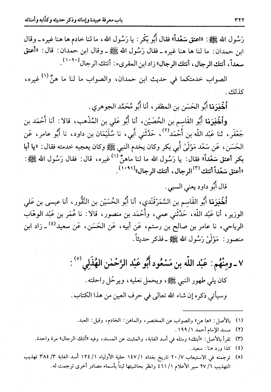 [1091] الصواب خدمتكما في حديث ابن حمدان والصواب ما لنا ما هن (1) غيره كذلك أخبرنا أبو الحسن بن المظفر أنا أبو محمد الجوهري وأخبرنا أبو القاسم بن الحصين أنا أبو علي بن المذهب قالا أنا أحمد بن جعفر ثنا عبد الله بن أحمد (2) حدثني أبي نا سليمان بن داود نا أبو عامر عن الحسن عن سعد مولى أبي بكر وكان يخدم النبي (صلى الله عليه وسلم) وكان يعجبه خدمته فقال يا أبا بكر اعتق سعدا فقال يا رسول الله ما لنا ما هن غيره قال فقال رسول الله (صلى الله عليه وسلم) أعتق سعدا أتتك (3) الرجال أتتك الرجال قال أبو داود يعني السبي أخبرنا أبو القاسم بن السمرقندي أنا أبو الحسين بن النقور أنا عيسى بن علي الوزير أنا عبد الله حدثني عمي وأحمد بن منصور قالا نا عمر بن عبد الوهاب الرياحي نا عامر بن صالح بن رستم عن أبيه عن الحسن عن سعيد (4) زاد ابن منصور مولى رسول الله (صلى الله عليه وسلم) فذكر حديثا 7 ومنهم عبد الله بن مسعود أبو عبد الرحمن الهذلي (5) كان يلي طهور النبي (صلى الله عليه وسلم) ويحمل نعليه ويرحل راحلته وسيأتي ذكره إن شاء الله تعالى في حرف العين من هذا الكتاب
