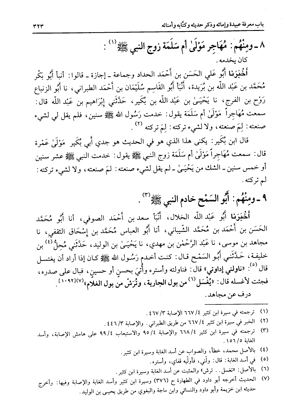 8 - ومنهم مهاجر مولى أم سلمة زوج النبي (صلى الله عليه وسلم) (1) كان يخدمه أخبرنا أبو علي الحسن بن أحمد الحداد وجماعة إجازة قالوا أنبأ أبو بكر محمد بن عبد الله بن بريدة أنبأ أبو القاسم سليمان بن أحمد الطبراني نا أبو الزنباع روح بن الفرج نا يحيى بن عبد الله بن بكير حدثني إبراهيم بن عبد الله قال سمعت مهاجرا مولى أم سلمة يقول خدمت رسول الله (صلى الله عليه وسلم) سنين فلم يقل لي لشئ صنعته لم صنعته ولا لشئ تركته لم تركته (2) قال ابن بكير يكنى هذا الذي هو في الحديث هو جدي أبي بكير مولى عمرة قال سمعت مهاجرا مولى أم سلمة زوج النبي (صلى الله عليه وسلم) يقول خدمت النبي (صلى الله عليه وسلم) عشر سنين أو خمس سنين الشك من يحيى لم يقل لشئ صنعته لم صنعته ولا لشئ تركته لم تركته 9 ومنهم أبو السمح خادم النبي (صلى الله عليه وسلم) (3) أخبرنا أبو عبد الله الخلال أنبأ سعد بن أحمد الصوفي أنا أبو محمد الحسن بن أحمد بن محمد الشيباني أنا أبو العباس محمد بن إسحاق الثقفي نا مجاهد بن موسى نا عبد الرحمن بن مهدي نا يحيى بن الوليد حدثني محل (4) بن خليفة حدثني أبو السمح قال كنت أخدم رسول الله (صلى الله عليه وسلم) كان إذا أراد أن يغتسل قال (5) ناولني إداوتي قال فناولته وأستره وأتي بحسن أو حسين فبال على صدره فجئت لأغسله قال يغسل (6) من بول الجارية وترش من بول الغلام (7)