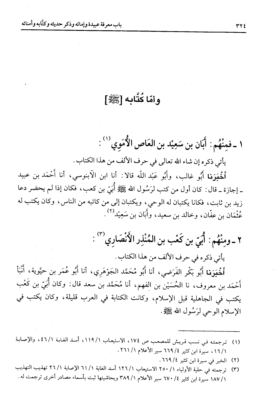 وأما كتابه صلى الله عليه وسلم 1 فمنهم أبان بن سعيد بن العاص الأموي (1) يأتي ذكره إن شاء الله تعالى في حرف الألف من هذا الكتاب أخبرنا أبو غالب وأبو عبد الله قالا أنا ابن الآبنوسي أنا أحمد بن عبيد إجازة قال كان أول من كتب لرسول الله (صلى الله عليه وسلم) أبي بن كعب فكان إذا لم يحضر دعا زيد بن ثابت فكانا يكتبان له الوحي ويكتبان إلى من كاتبه من الناس وكان يكتب له عثمان بن عفان وخالد بن سعيد وأبان بن سعيد (2) 2 ومنهم أبي بن كعب بن المنذر الأنصاري (3) يأتي ذكره في حرف الألف من هذا الكتاب أخبرنا أبو بكر الفرضي أنا أبو محمد الجوهري أنا أبو عمر بن حيوية أنبأ أحمد بن معروف نا الحسين بن الفهم أنا محمد بن سعد قال وكان أبي بن كعب يكتب في الجاهلية قبل الإسلام وكانت الكتابة في العرب قليلة وكان يكتب في الإسلام الوحي لرسول الله (صلى الله عليه وسلم)