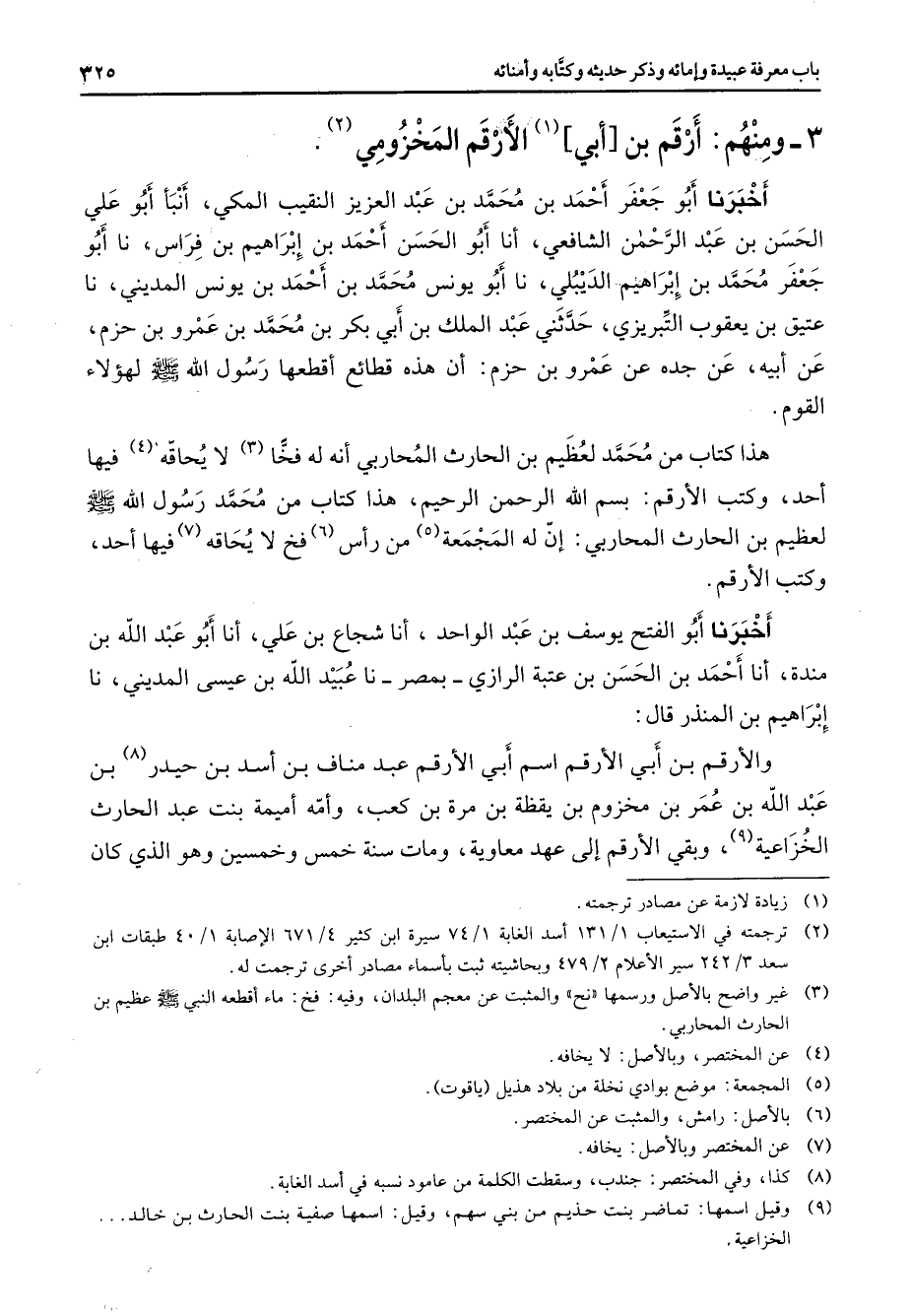 3 - ومنهم أرقم بن أبي (1) الأرقم المخزومي (2) أخبرنا أبو جعفر أحمد بن محمد بن عبد العزيز النقيب المكي أنبأ أبو علي الحسن بن عبد الرحمن الشافعي أنا أبو الحسن أحمد بن إبراهيم بن فراس نا أبو جعفر محمد بن إبراهيم الديبلي نا أبو يونس محمد بن أحمد بن يونس المديني نا عتيق بن يعقوب التبريزي حدثني عبد الملك بن أبي بكر بن محمد بن عمرو بن حزم عن أبيه عن جده عن عمرو بن حزم أن هذه قطائع أقطعها رسول الله (صلى الله عليه وسلم) لهؤلاء القوم هذا كتاب من محمد لعظيم بن الحارث المحاربي أنه له فخا (3) لا يحاقه (4) فيها أحد وكتب الأرقم بسم الله الرحمن الرحيم هذا كتاب من محمد رسول الله (صلى الله عليه وسلم) لعظيم بن الحارث المحاربي إن له المجمعة (5) من رأس (6) فخ لا يحاقه (7) فيها أحد وكتب الأرقم أخبرنا أبو الفتح يوسف بن عبد الواحد أنا شجاع بن علي أنا أبو عبد الله بن مندة أنا أحمد بن الحسن بن عتبة الرازي بمصر نا عبيد الله بن عيسى المديني نا إبراهيم بن المنذر قال والأرقم بن أبي الأرقم اسم أبي الأرقم عبد مناف بن أسد بن حيدر (8) بن عبد الله بن عمر بن مخزوم بن يقظة بن مرة بن كعب وأمه أميمة بنت عبد الحارث الخزاعية (9) وبقي الأرقم إلى عهد معاوية ومات سنة خمس وخمسين وهو الذي كان