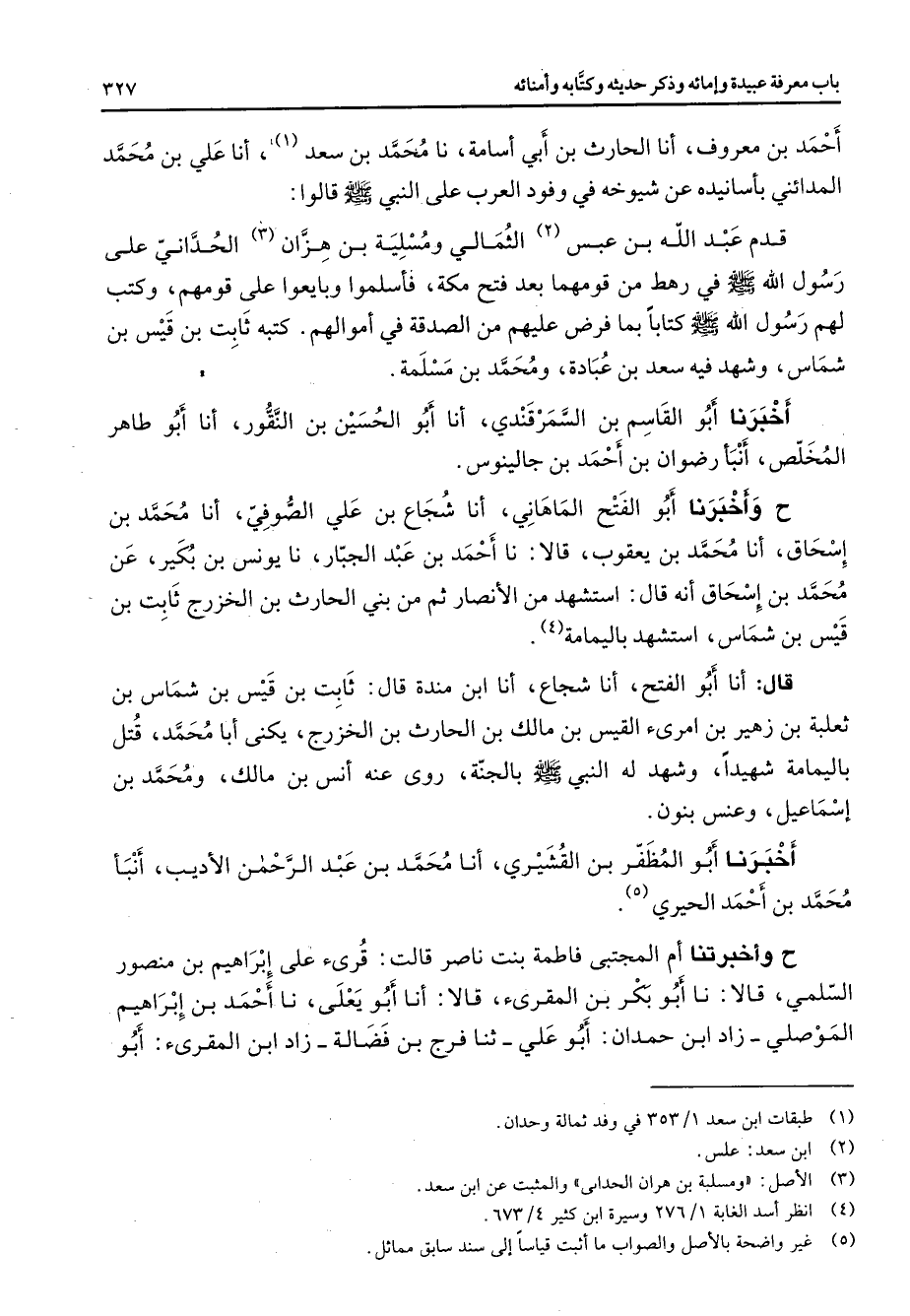 أحمد بن معروف أنا الحارث بن أبي أسامة نا محمد بن سعد (1) أنا علي بن محمد المدائني بأسانيده عن شيوخه في وفود العرب على النبي (صلى الله عليه وسلم) قالوا قدم عبد الله بن عبس (2) الثمالي ومسلية بن هزان (3) الحداني على رسول الله (صلى الله عليه وسلم) في رهط من قومهما بعد فتح مكة فأسلموا وبايعوا على قومهم وكتب لهم رسول الله (صلى الله عليه وسلم) كتابا بما فرض عليهم من الصدقة في أموالهم كتبه ثابت بن قيس بن شماس وشهد فيه سعد بن عبادة ومحمد بن مسلمة أخبرنا أبو القاسم بن السمرقندي أنا أبو الحسين بن النقور أنا أبو طاهر المخلص أنبأ رضوان بن أحمد بن جالينوس ح وأخبرنا أبو الفتح الماهاني أنا شجاع بن علي الصوفي أنا محمد بن إسحاق أنا محمد بن يعقوب قالا نا أحمد بن عبد الجبار نا يونس بن بكير عن محمد بن إسحاق أنه قال استشهد من الأنصار ثم من بني الحارث بن الخزرج ثابت بن قيس بن شماس استشهد باليمامة (4) قال أنا أبو الفتح أنا شجاع أنا ابن مندة قال ثابت بن قيس بن شماس بن ثعلبة بن زهير بن امرئ القيس بن مالك بن الحارث بن الخزرج يكنى أبا محمد قتل باليمامة شهيدا وشهد له النبي (صلى الله عليه وسلم) بالجنة روى عنه أنس بن مالك ومحمد بن إسماعيل وعنس بنون أخبرنا أبو المظفر بن القشيري أنا محمد بن عبد الرحمن الأديب أنبأ محمد بن أحمد الحيري (5) ح وأخبرتنا أم المجتبى فاطمة بنت ناصر قالت قرئ على إبراهيم بن منصور السلمي قالا نا أبو بكر بن المقرئ قالا أنا أبو يعلى نا أحمد بن إبراهيم الموصلي زاد ابن حمدان أبو علي ثنا فرج بن فضالة زاد ابن المقرئ أبو