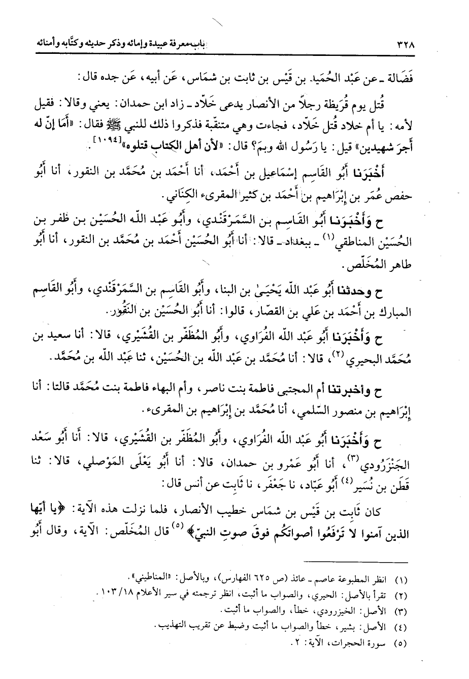 [1094] أخبرنا أبو القاسم إسماعيل بن أحمد أنا أحمد بن محمد بن النقور أنا أبو حفص عمر بن إبراهيم بن احمد بن كثير المقرئ الكناني ح وأخبرنا أبو القاسم بن السمرقندي وأبو عبد الله الحسين بن ظفر بن الحسين المناطقي (1) ببغداد قالا أنا أبو الحسين أحمد بن محمد بن النقور أنا أبو طاهر المخلص ح وحدثنا أبو عبد الله يحيى بن البنا وأبو القاسم بن السمرقندي وأبو القاسم المبارك بن أحمد بن علي بن القصار قالوا أنا أبو الحسين بن النقور ح وأخبرنا أبو عبد الله الفراوي وأبو المظفر بن القشيري قالا أنا سعيد بن محمد البحيري (2) قالا أنا محمد بن عبد الله بن الحسين ثنا عبد الله بن محمد ح وأخبرتنا أم المجتبى فاطمة بنت ناصر وأم البهاء فاطمة بنت محمد قالتا أنا إبراهيم بن منصور السلمي أنا محمد بن إبراهيم بن المقرئ ح وأخبرنا أبو عبد الله الفراوي وأبو المظفر بن القشيري قالا أنا أبو سعد الجنزرودي (3) أنا أبو عمرو بن حمدان قالا أنا أبو يعلى الموصلي قالا ثنا قطن بن نسير (4) أبو عباد نا جعفر نا ثابت عن أنس قال كان ثابت بن قيس بن شماس خطيب الأنصار فلما نزلت هذه الآية " يا أيها الذين آمنوا لا ترفعوا أصواتكم فوق صوت النبي " قال المخلص الآية وقال أبو