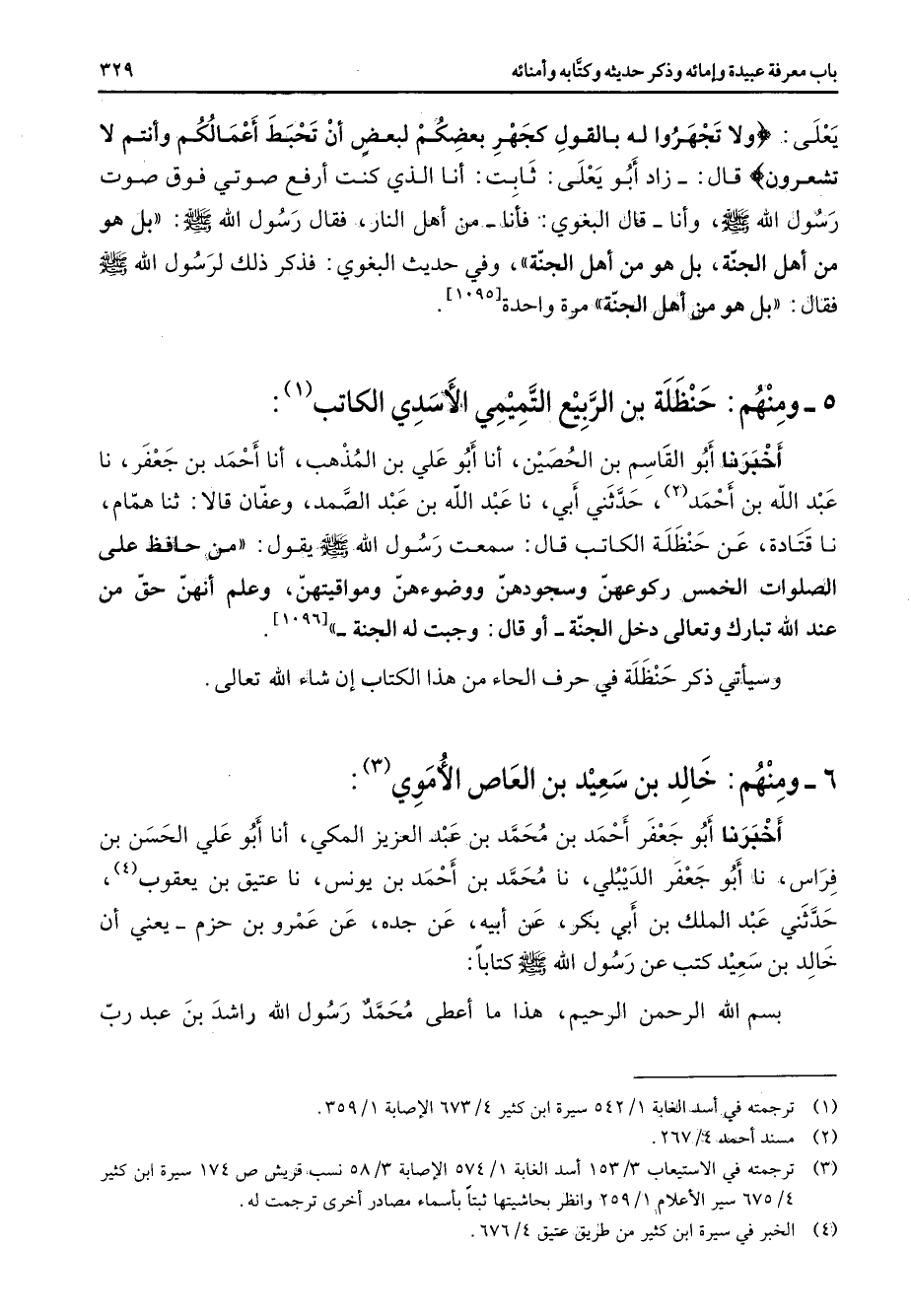 [1096] وسيأتي ذكر حنظلة في حرف الحاء من هذا الكتاب إن شاء الله تعالى 6 ومنهم خالد بن سعيد بن العاص الأموي (3) أخبرنا أبو جعفر أحمد بن محمد بن عبد العزيز المكي أنا أبو علي الحسن بن فراس نا أبو جعفر الديبلي نا محمد بن أحمد بن يونس نا عتيق بن يعقوب (4) حدثني عبد الملك بن أبي بكر عن أبيه عن جده عن عمرو بن حزم يعني أن خالد بن سعيد كتب عن رسول الله (صلى الله عليه وسلم) كتابا بسم الله الرحمن الرحيم هذا ما أعطى محمد رسول الله راشد بن عبد رب