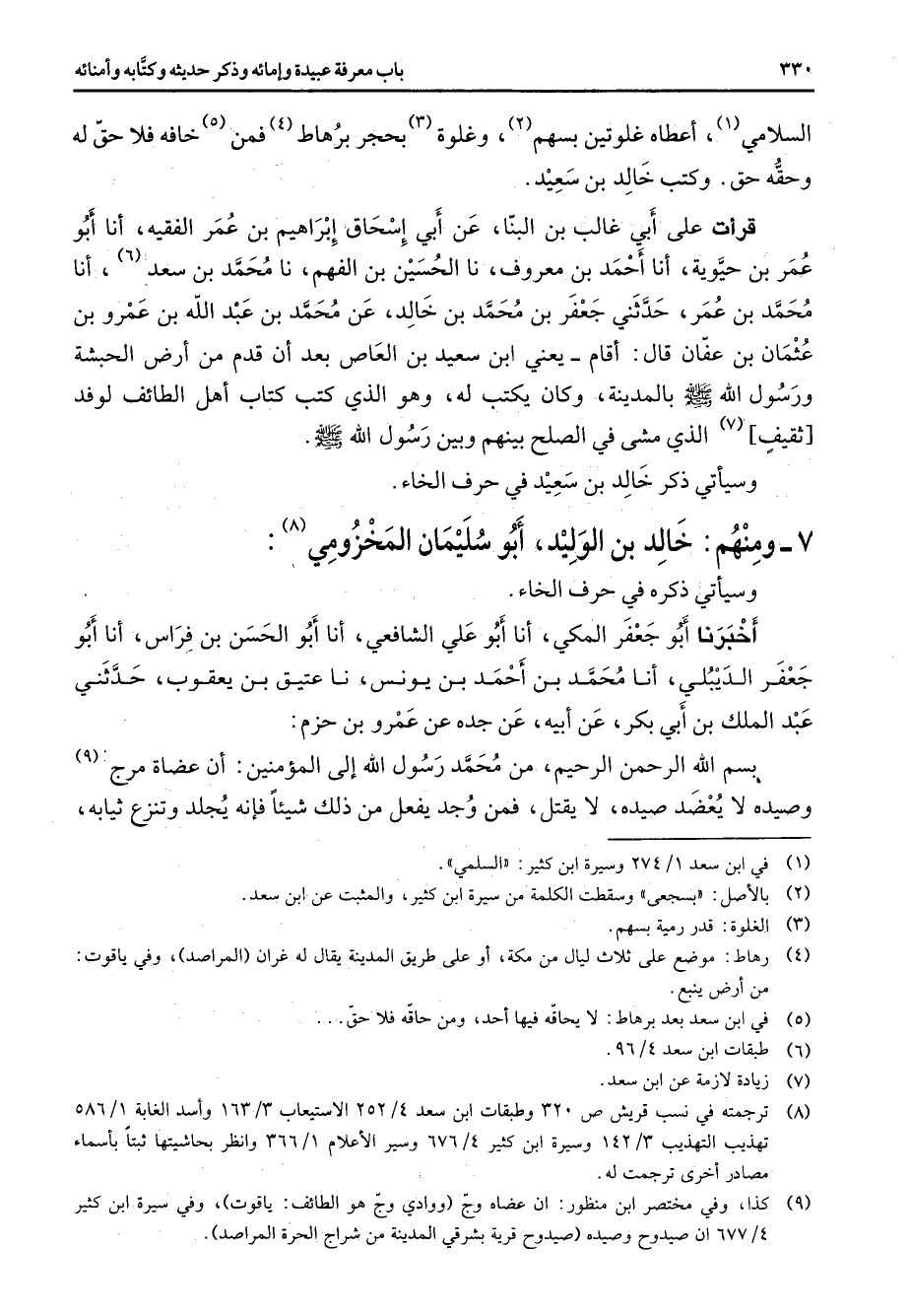 السلامي (1) أعطاه غلوتين بسهم (2) وغلوة (3) بحجر برهاط (4) فمن (5) خافه فلا حق له وحقه حق وكتب خالد بن سعيد قرأت على أبي غالب بن البنا عن أبي إسحاق إبراهيم بن عمر الفقيه أنا أبو عمر بن حيوية أنا أحمد بن معروف نا الحسين بن الفهم نا محمد بن سعد (6) أنا محمد بن عمر حدثني جعفر بن محمد بن خالد عن محمد بن عبد الله بن عمرو بن عثمان بن عفان قال أقام يعني ابن سعيد بن العاص بعد أن قدم من أرض الحبشة ورسول الله (صلى الله عليه وسلم) بالمدينة وكان يكتب له وهو الذي كتب كتاب أهل الطائف لوفد ثقيف (7) الذي مشى في الصلح بينهم وبين رسول الله (صلى الله عليه وسلم) وسيأتي ذكر خالد بن سعيد في حرف الخاء 7 ومنهم خالد بن الوليد أبو سليمان المخزومي (8) وسيأتي ذكره في حرف الخاء أخبرنا أبو جعفر المكي أنا أبو علي الشافعي أنا أبو الحسن بن فراس أنا أبو جعفر الديبلي أنا محمد بن أحمد بن يونس نا عتيق بن يعقوب حدثني عبد الملك بن أبي بكر عن أبيه عن جده عن عمرو بن حزم بسم الله الرحمن الرحيم من محمد رسول الله إلى المؤمنين أن عضاة مرج (9) وصيده لا يعضد صيده لا يقتل فمن وجد يفعل من ذلك شيئا فإنه يجلد وتنزع ثيابه