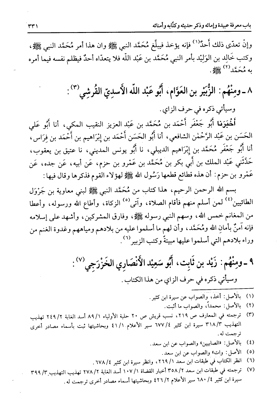 وإن تعدى ذلك أحد (1) فإنه يؤخذ فيبلغ محمد النبي (صلى الله عليه وسلم) وان هذا أمر محمد النبي (صلى الله عليه وسلم) وكتب خالد بن الوليد بأمر النبي محمد بن عبد الله فلا يتعداه أحد فيظلم نفسه فيما أمره به محمد (2) (صلى الله عليه وسلم) 8 ومنهم الزبير بن العوام أبو عبد الله الأسدي القرشي (3) وسيأتي ذكره في حرف الزاي أخبرنا أبو جعفر أحمد بن محمد بن عبد العزيز النقيب المكي أنا أبو علي الحسن بن عبد الرحمن الشافعي أنا أبو الحسن أحمد بن إبراهيم بن أحمد بن فراس أنا أبو جعفر محمد بن إبراهيم الديبلي نا أبو يونس المديني نا عتيق بن يعقوب حدثني عبد الملك بن أبي بكر بن محمد بن عمرو بن حزم عن أبيه عن جده عن عمرو بن حزم أن هذه قطائع قطعها رسول الله (صلى الله عليه وسلم) لهؤلاء القوم فذكرها وقال فيها بسم الله الرحمن الرحيم هذا كتاب من محمد النبي (صلى الله عليه وسلم) لبني معاوية بن جرول الطائيين (4) لمن أسلم منهم فأقام الصلاة وآتى (5) الزكاة وأطاع الله ورسوله وأعطا من المغانم خمس الله وسهم النبي رسوله (صلى الله عليه وسلم) وفارق المشركين وأشهد على إسلامه فإنه آمن بأمان الله ومحمد وأن لهم ما أسلموا عليه من بلادهم ومياههم وغدوة الغنم من وراء بلادهم التي أسلموا عليها مبيتة وكتب الزبير (6) 9 ومنهم زيد بن ثابت أبو سعيد الأنصاري الخزرجي (7) وسيأتي ذكره في حرف الزاي من هذا الكتاب