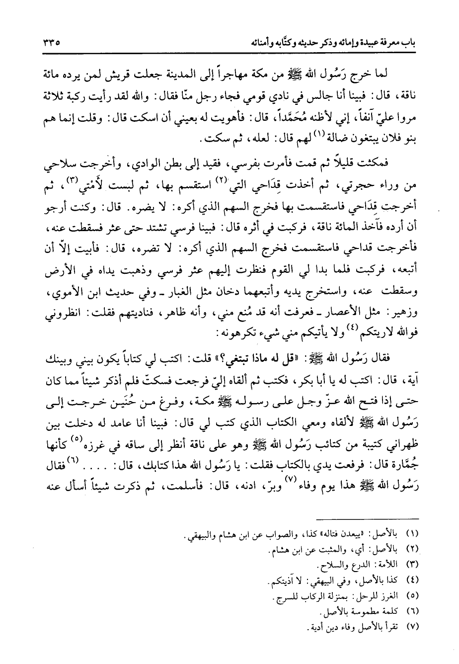 لما خرج رسول الله (صلى الله عليه وسلم) من مكة مهاجرا إلى المدينة جعلت قريش لمن يرده مائة ناقة قال فبينا أنا جالس في نادي قومي فجاء رجل منا فقال والله لقد رأيت ركبة ثلاثة مروا علي آنفا إني لأظنه محمدا قال فأهويت له بعيني أن اسكت قال وقلت إنما هم بنو فلان يبتغون ضالة (1) لهم قال لعله ثم سكت فمكثت قليلا ثم قمت فأمرت بفرسي فقيد إلى بطن الوادي وأخرجت سلاحي من وراء حجرتي ثم أخذت قداحي التي استقسم بها ثم لبست لأمتي (3) ثم أخرجت قداحي فاستقسمت بها فخرج السهم الذي اكره لا يضره قال وكنت أرجو أن أرده فآخذ المائة ناقة فركبت في أثره قال فبينا فرسي تشتد حتى عثر فسقطت عنه فأخرجت قداحي فاستقسمت فخرج السهم الذي أكره لا تضره قال فأبيت إلا أن أتبعه فركبت فلما بدا لي القوم فنظرت إليهم عثر فرسي وذهبت يداه في الأرض وسقطت عنه واستخرج يديه وأتبعهما دخان مثل الغبار وفي حديث ابن الأموي وزهير مثل الأعصار فعرفت أنه قد منع مني وأنه ظاهر فناديتهم فقلت انظروني فوالله لاريتكم (4) ولا يأتيكم مني شئ تكرهونه فقال رسول الله (صلى الله عليه وسلم) قل له ماذا تبتغي قلت اكتب لي كتابا يكون بيني وبينك آية قال اكتب له يا أبا بكر فكتب ثم ألقاه إلي فرجعت فسكت فلم أذكر شيئا مما كان حتى إذا فتح الله عز وجل على رسوله (صلى الله عليه وسلم) مكة وفرغ من حنين خرجت إلى رسول الله (صلى الله عليه وسلم) لألقاه ومعي الكتاب الذي كتب لي قال فبينا أنا عامد له دخلت بين ظهراني كتبيه من كتائب رسول الله (صلى الله عليه وسلم) وهو على ناقة أنظر إلى ساقه في غرزه (5) كأنها جمارة قال فرفعت يدي بالكتاب فقلت يا رسول الله هذا كتابك قال (6) فقال رسول الله (صلى الله عليه وسلم) هذا يوم وفاء (7) وبر ادنه قال فأسلمت ثم ذكرت شيئا أسأل عنه
