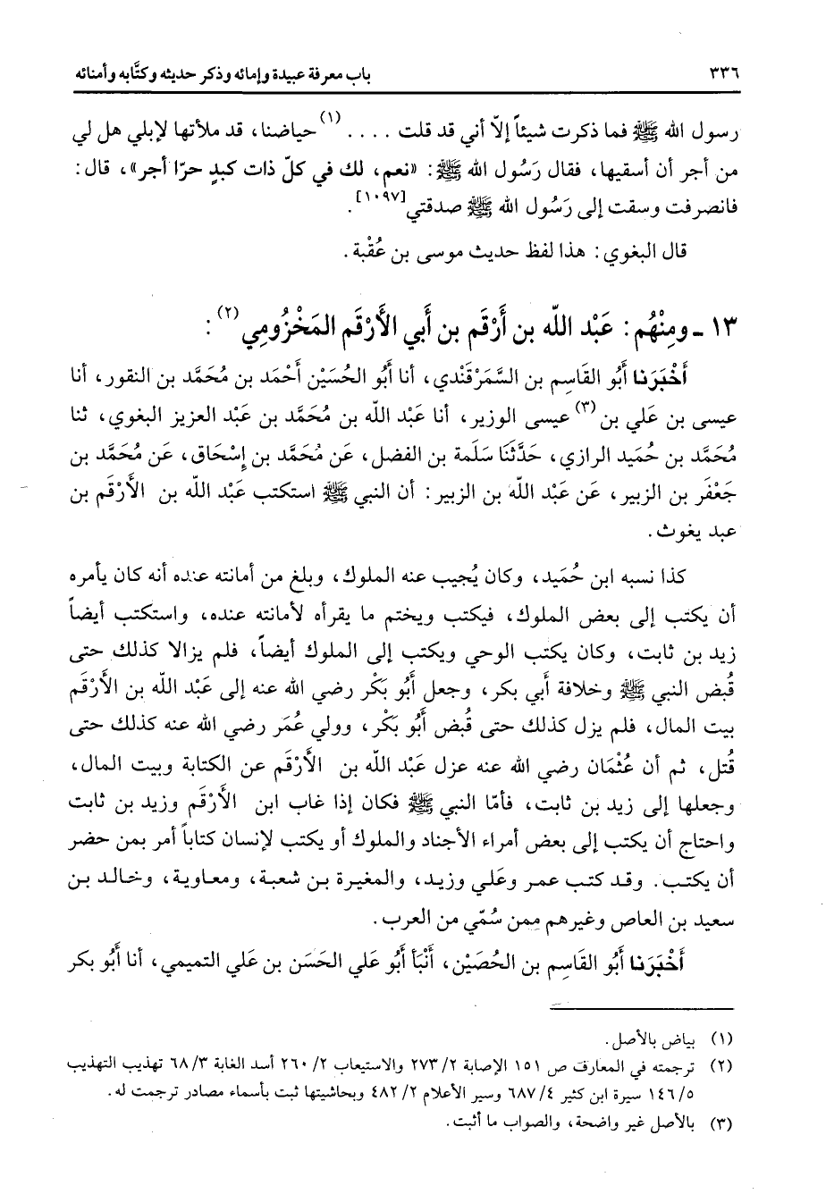 [1097] قال البغوي هذا لفظ حديث موسى بن عقبة 13 ومنهم عبد الله بن أرقم بن أبي الأرقم المخزومي (2) أخبرنا أبو القاسم بن السمرقندي أنا أبو الحسين أحمد بن محمد بن النقور أنا عيسى بن علي بن (3) عيسى الوزير أنا عبد الله بن محمد بن عبد العزيز البغوي ثنا محمد بن حميد الرازي حدثنا سلمة بن الفضل عن محمد بن إسحاق عن محمد بن جعفر بن الزبير عن عبد الله بن الزبير أن النبي (صلى الله عليه وسلم) استكتب عبد الله بن الأرقم بن عبد يغوث كذا نسبه ابن حميد وكان يجيب عنه الملوك وبلغ من أمانته عنده أنه كان يأمره أن يكتب إلى بعض الملوك فيكتب ويختم ما يقرأه لأمانته عنده واستكتب أيضا زيد بن ثابت وكان يكتب الوحي ويكتب إلى الملوك أيضا فلم يزالا كذلك حتى قبض النبي (صلى الله عليه وسلم) وخلافة أبي بكر وجعل أبو بكر Bهـ إلى عبد الله بن الأرقم بيت المال فلم يزل كذلك حتى قبض أبو بكر وولي عمر Bهـ كذلك حتى قتل ثم أن عثمان Bهـ عزل عبد الله بن الأرقم عن الكتابة وبيت المال وجعلها إلى زيد بن ثابت فأما النبي (صلى الله عليه وسلم) فكان إذا غاب ابن الأرقم وزيد بن ثابت واحتاج أن يكتب إلى بعض أمراء الأجناد والملوك أو يكتب لإنسان كتابا أمر بمن حضر أن يكتب وقد كتب عمر وعلي وزيد والمغيرة بن شعبة ومعاوية وخالد بن سعيد بن العاص وغيرهم ممن سمي من العرب أخبرنا أبو القاسم بن الحصين أنبأ أبو علي الحسن بن علي التميمي أنا أبو بكر