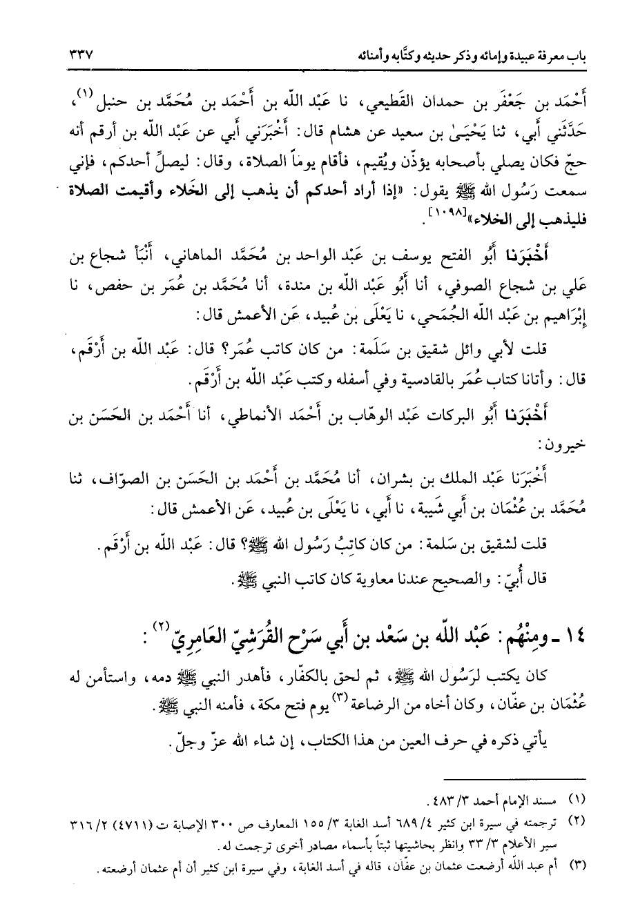 [1098] أخبرنا أبو الفتح يوسف بن عبد الواحد بن محمد الماهاني أنبأ شجاع بن علي بن شجاع الصوفي أنا أبو عبد الله بن مندة أنا محمد بن عمر بن حفص نا إبراهيم بن عبد الله الجمحي نا يعلى بن عبيد عن الأعمش قال قلت لأبي وائل شقيق بن سلمة من كان كاتب عمر قال عبد الله بن أرقم قال وأتانا كتاب عمر بالقادسية وفي أسفله وكتب عبد الله بن أرقم أخبرنا أبو البركات عبد الوهاب بن أحمد الأنماطي أنا أحمد بن الحسين بن خيرون أخبرنا عبد الملك بن بشران أنا محمد بن أحمد بن الحسن بن الصواف ثنا محمد بن عثمان بن أبي شيبة نا أبي نا يعلى بن عبيد عن الأعمش قال قلت لشقيق بن سلمة من كان كاتب رسول الله (صلى الله عليه وسلم) قال عبد الله بن أرقم قال أبي والصحيح عندنا معاوية كان كاتب النبي (صلى الله عليه وسلم) 14 ومنهم عبد الله بن سعد بن أبي سرح القرشي العامري (2) كان يكتب لرسول الله (صلى الله عليه وسلم) ثم لحق بالكفار فأهدر النبي (صلى الله عليه وسلم) دمه واستأمن له عثمان بن عفان وكان أخاه من الرضاعة (3) يوم فتح مكة فأمنه النبي (صلى الله عليه وسلم) يأتي ذكره في حرف العين من هذا الكتاب إن شاء الله عز وجل