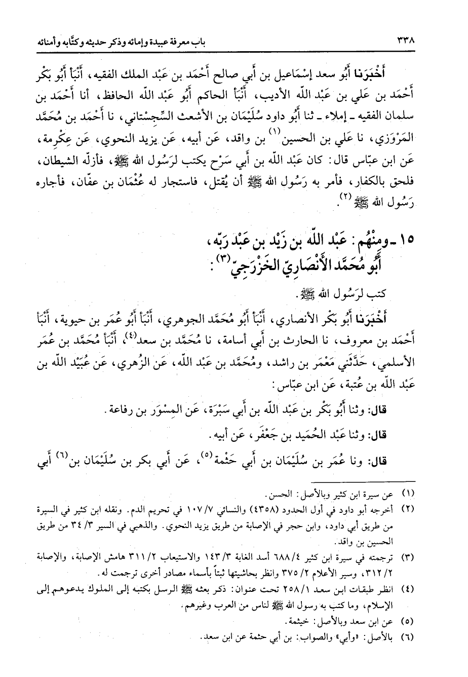 أخبرنا أبو سعد إسماعيل بن أبي صالح أحمد بن عبد الملك الفقيه أنبأ أبو بكر أحمد بن علي بن عبد الله الأديب أنبأ الحاكم أبو عبد الله الحافظ أنا أحمد بن سلمان الفقيه إملاء ثنا أبو داود سليمان بن الأشعث السجستاني نا أحمد بن محمد المروزي نا علي بن الحسين (1) بن واقد عن أبيه عن يزيد النحوي عن عكرمة عن ابن عباس قال كان عبد الله بن أبي سرح يكتب لرسول الله (صلى الله عليه وسلم) فأزله الشيطان فلحق بالكفار فأمر به رسول الله (صلى الله عليه وسلم) أن يقتل فاستجار له عثمان بن عفان فأجاره رسول الله (صلى الله عليه وسلم) (2) 15 ومنهم عبد الله بن زيد بن عبد ربه أبو محمد الأنصاري الخزرجي (3) كتب لرسول الله (صلى الله عليه وسلم) أخبرنا أبو بكر الأنصاري أنبأ أبو محمد الجوهري أنبأ أبو عمر بن حيوية أنبأ أحمد بن معروف نا الحارث بن أبي أسامة نا محمد بن سعد (4) أنبأ محمد بن عمر الأسلمي حدثني معمر بن راشد ومحمد بن عبد الله عن الزهري عن عبيد الله بن عبد الله بن عتبة عن ابن عباس قال وثنا أبو بكر بن عبد الله بن أبي سبرة عن المسور بن رفاعة قال وثنا عبد الحميد بن جعفر عن أبيه قال ونا عمر بن سليمان بن أبي حثمة (5) عن أبي بكر بن سليمان بن (6) أبي