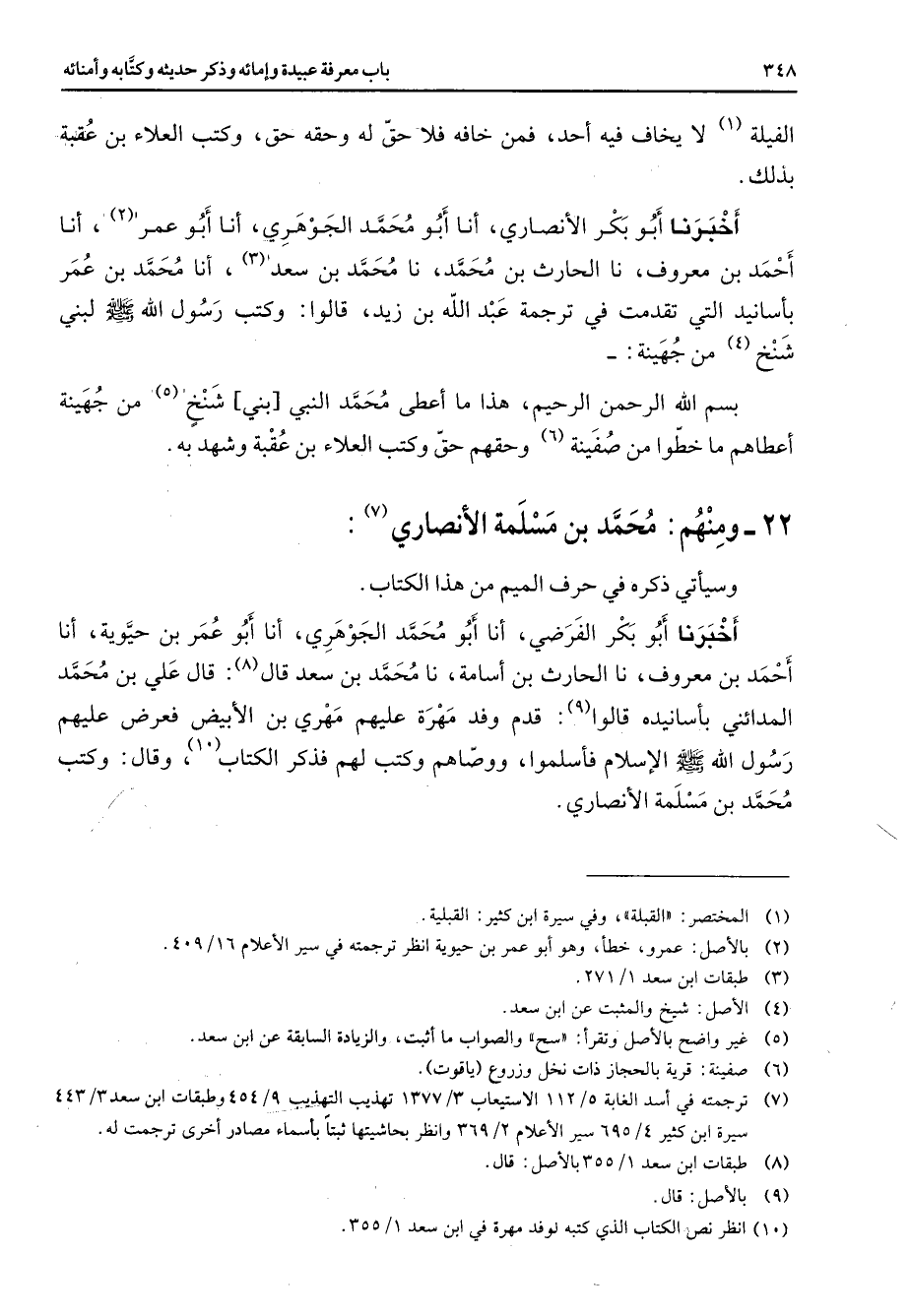 الفيلة (1) لا يخاف فيه أحد فمن خافه فلا حق له وحقه حق وكتب العلاء بن عقبة بذلك أخبرنا أبو بكر الأنصاري أنا أبو محمد الجوهري أنا أبو عمر (2) أنا أحمد بن معروف نا الحارث بن محمد نا محمد بن سعد (3) أنا محمد بن عمر بأسانيد التي تقدمت في ترجمة عبد الله بن زيد قالوا وكتب رسول الله (صلى الله عليه وسلم) لبني شنخ (4) من جهينة بسم الله الرحمن الرحيم هذا ما أعطى محمد النبي بني شنخ (5) من جهينة أعطاهم ما خطوا من صفينة (6) وحقهم حق وكتب العلاء بن عقبة وشهد به 22 ومنهم محمد بن مسلمة الأنصاري (7) وسيأتي ذكره في حرف الميم من هذا الكتاب أخبرنا أبو بكر الفرضي أنا أبو محمد الجوهري أنا أبو عمر بن حيوية أنا أحمد بن معروف نا الحارث بن أسامة نا محمد بن سعد قال (8) قال علي بن محمد المدائني بأسانيده قالوا (9) قدم وفد مهرة عليهم مهري بن الأبيض فعرض عليهم رسول الله (صلى الله عليه وسلم) الإسلام فأسلموا ووصاهم وكتب لهم فذكر الكتاب (10) وقال وكتب محمد بن مسلمة الأنصاري
