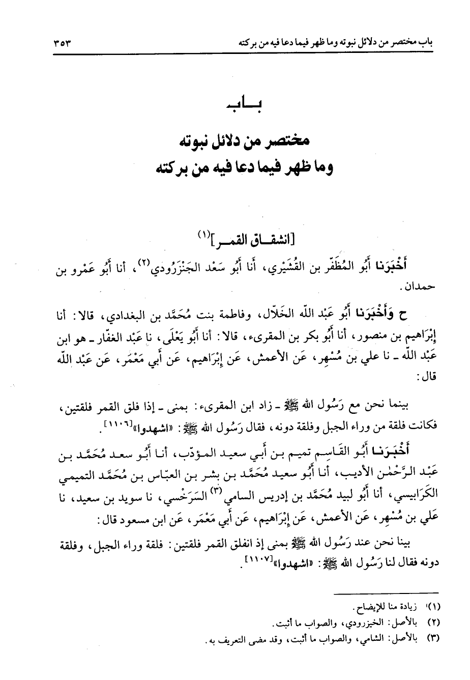 " باب مختصر من دلائل نبوته وما ظهر فيما دعا فيه من بركته " انشقاق القمر (1) أخبرنا أبو المظفر بن القشيري أنا أبو سعد الجنزرودي (2) أنا أبو عمرو بن حمدان ح وأخبرنا أبو عبد الله الخلال وفاطمة بنت محمد بن البغدادي قالا أنا إبراهيم بن منصور أنا أبو بكر بن المقرئ قالا أنا أبو يعلى نا عبد الغفار هو ابن عبد الله نا علي بن مسهر عن الأعمش عن إبراهيم عن أبي معمر عن عبد الله قال بينما نحن مع رسول الله (صلى الله عليه وسلم) زاد ابن المقرئ بمنى إذا فلق القمر فلقتين فكانت فلقة من وراء الجبل وفلقة دونه فقال رسول الله (صلى الله عليه وسلم) اشهدوا