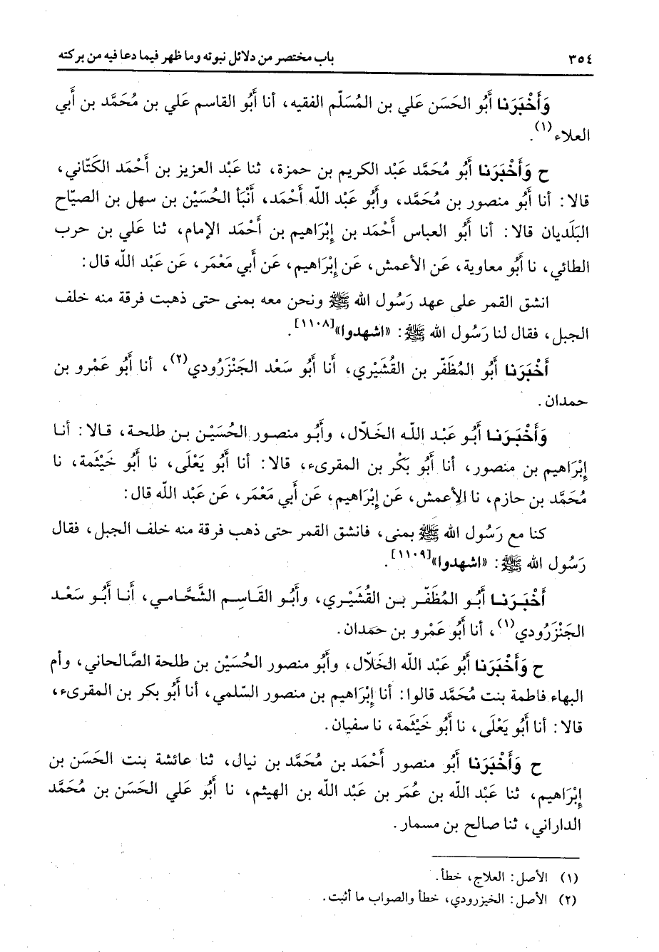 وأخبرنا أبو الحسن علي بن المسلم الفقيه أنا أبو القاسم علي بن محمد بن أبي العلاء (1) ح وأخبرنا أبو محمد عبد الكريم بن حمزة ثنا عبد العزيز بن أحمد الكتاني قالا أنا أبو منصور بن محمد وأبو عبد الله أحمد أنبأ الحسين بن سهل بن الصياح البلديان قالا أنا أبو العباس أحمد بن إبراهيم بن أحمد الإمام ثنا علي بن حرب الطائي نا أبو معاوية عن الأعمش عن إبراهيم عن أبي معمر عن عبد الله قال انشق القمر على عهد رسول الله (صلى الله عليه وسلم) ونحن معه بمنى حتى ذهبت فرقة منه خلف الجبل فقال لنا رسول الله (صلى الله عليه وسلم) اشهدوا