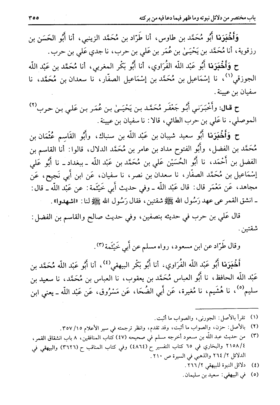 وأخبرنا أبو محمد بن طاوس أنا طراد بن محمد الزينبي أنا أبو الحسن بن رزقوية أنا محمد بن يحيى بن عمر بن علي بن حرب نا جدي علي بن حرب ح وأخبرنا أبو عبد الله الفراوي أنا أبو بكر المغربي أنا محمد بن عبد الله الجوزقي (1) نا إسماعيل بن محمد بن إسماعيل الصفار نا سعدان بن محمد نا سفيان بن عيينة ح قال وأخبرني أبو جعفر محمد بن يحيى بن عمر بن علي بن حرب (2) الموصلي نا علي بن حرب الطائي قالا نا سفيان بن عيينة ح وأخبرنا أبو سعيد شيبان بن عبد الله بن سنباك وأبو القاسم عثمان بن محمد بن الفضل وأبو الفتوح مداد بن عامر بن محمد الدلال قالوا أنا القاسم بن الفضل بن أحمد نا أبو الحسين علي بن محمد بن عبد الله ببغداد نا أبو علي إسماعيل بن محمد الصفار نا سعدان بن نصر نا سفيان عن ابن أبي نجيح عن مجاهد عن معمر قال قال عبد الله وفي حديث أبي خيثمة عن عبد الله قال انشق القمر على عهد رسول الله (صلى الله عليه وسلم) شقتين فقال رسول الله (صلى الله عليه وسلم) لنا اشهدوا قال علي بن حرب في حديثه بنصفين وفي حديث صالح والقاسم بن الفضل شقتين وقال طراد عن ابن مسعود رواه مسلم عن أبي خيثمة (3) أخبرنا أبو عبد الله الفراوي أنا أبو بكر البيهقي (4) أنا أبو عبد الله محمد بن عبد الله الحافظ نا أبو العباس محمد بن يعقوب نا العباس بن محمد نا سعيد بن سليم (5) نا هشيم نا مغيرة عن أبي الضحا عن مسروق عن عبد الله يعني ابن