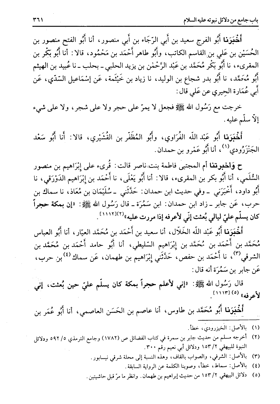 أخبرنا أبو الفرج سعيد بن أبي الرجاء بن أبي منصور أنا أبو الفتح منصور بن الحسين بن علي بن القاسم الكاتب وأبو طاهر أحمد بن محمود قالا أنا أبو بكر بن المقرئ نا أبو بكر محمد بن عبد الرحمن بن يزيد الحلبي بحلب نا عبيد بن الهيثم أبو محمد نا أبو بدر شجاع بن الوليد نا زياد بن خيثمة عن إسماعيل السدي عن أبي عمارة الحيري عن علي قال خرجت مع رسول الله (صلى الله عليه وسلم) فجعل لا يمر على حجر ولا على شجر ولا على شئ إلا سلم عليه أخبرنا أبو عبد الله الفراوي وأبو المظفر بن القشيري قالا أنا أبو سعد الجنزرودي (1) أنا أبو عمرو بن حمدان ح وأخبرتنا أم المجتبى فاطمة بنت ناصر قالت قرئ على إبراهيم بن منصور السلمي أنا أبو بكر بن المقرئ قالا أنا أبو يعلى نا أحمد بن إبراهيم الدورقي نا أبو داود أخبرني وفي حديث ابن حمدان حدثني سليمان بن معاذ نا سماك بن حرب عن جابر زاد ابن حمدان ابن سمرة قال رسول الله (صلى الله عليه وسلم) إن بمكة حجرا كان يسلم علي ليالي بعثت إني لأعرفه إذا مررت عليه (2)