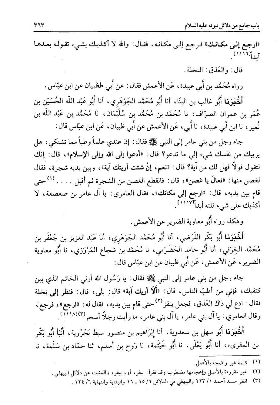 [1116] قال والعذق النخلة رواه محمد بن أبي عبيدة عن الأعمش فقال عن أبي طظبيان عن ابن عباس أخبرنا أبو غالب بن البنا أنا أبو محمد الجوهري أنا أبو عبد الله الحسين بن عمر بن عمران الصراف نا محمد بن محمد بن سليمان نا محمد بن عبد الله بن نمير نا ابن أبي عبيدة نا أبي عن الأعمش عن أبي ظبيان عن ابن عباس قال جاء رجل من بني عامر إلى النبي (صلى الله عليه وسلم) فقال إن عندي علما وطبا مما تشتكي هل يريبك من نفسك شئ إلى ما تدعو قال أدعوا إلى الله وإلى الإسلام قال إنك لتقول قولا فهل لك من آية قال نعم إن شئت أريتك آية وبين يديه شجرة فقال لغصن منها تعال يا غصن قال فانقطع الغصن من الشجرة ثم أقبل حتى (1) قام بين يديه قال ارجع إلى مكانك فقال العامري يا آل عامر بن صعصعة لا أكذبك على شئ قلته أبدا