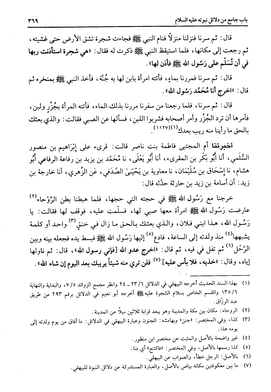 (1) بهذا السند الحديث اخرجخ البيهقي في الدلائل 6 / 23 - 24 وانظر مجمع الزوائد 5 / 7، والبداية والنهاية 6 / 135 والقسم الخاص بسلام الشجرة عليه صلى الله عليه وسلم اخرجه أبو نعيم في الدلائل برقم 293 من طريق عبد الرزاق