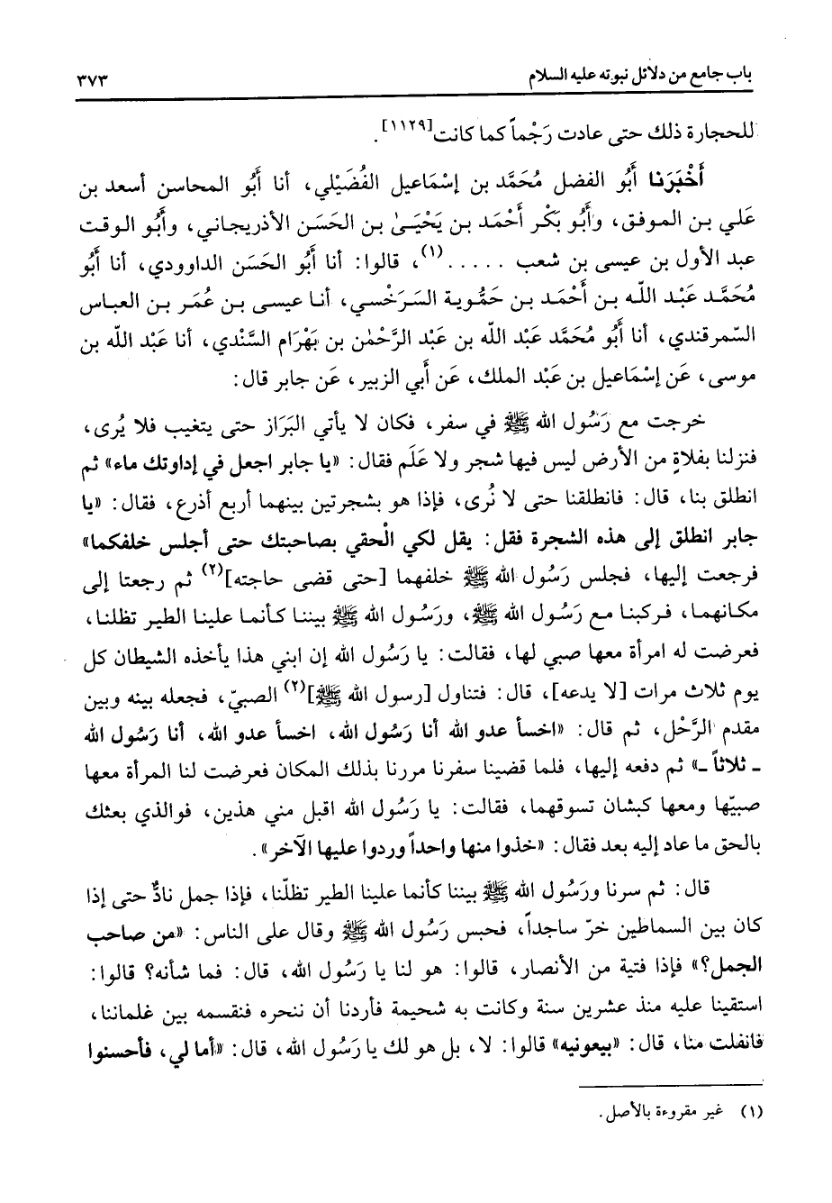 [1129] أخبرنا أبو الفضل محمد بن إسماعيل الفضيلي أنا أبو المحاسن أسعد بن علي بن الموفق وأبو بكر أحمد بن يحيى بن الحسن الأذريجاني وأبو الوقت عبد الأول بن عيسى بن شعب (1) قالوا أنا أبو الحسن الداوودي أنا أبو محمد عبد الله بن أحمد بن حموية السرخسي أنا عيسى بن عمر بن العباس السمرقندي أنا أبو محمد عبد الله بن عبد الرحمن بن بهرام السندي أنا عبد الله بن موسى عن إسماعيل بن عبد الملك عن أبي الزبير عن جابر قال خرجت مع رسول الله (صلى الله عليه وسلم) في سفر فكان لا يأتي البراز حتى يتغيب فلا يرى فنزلنا بفلاة من الأرض ليس فيها شجر ولا علم فقال يا جابر اجعل في إداوتك ماء ثم انطلق بنا قال فانطلقنا حتى لا نرى فإذا هو بشجرتين بينهما أربع أذرع فقال يا جابر انطلق إلى هذه الشجرة فقل يقل لكي الحقي بصاحبتك حتى أجلس خلفكما فرجعت إليها فجلس رسول الله (صلى الله عليه وسلم) خلفهما حتى قضى حاجته (2) ثم رجعتا إلى مكانهما فركبنا مع رسول الله (صلى الله عليه وسلم) ورسول الله (صلى الله عليه وسلم) بيننا كأنما علينا الطير تظلنا فعرضت له امرأة معها صبي لها فقالت يا رسول الله إن ابني هذا يأخذه الشيطان كل يوم ثلاث مرات لا يدعه قال فتناول رسول الله (صلى الله عليه وسلم) (2) الصبي فجعله بينه وبين مقدم الرحل ثم قال اخسأ عدو الله أنا رسول الله اخسأ عدو الله أنا رسول الله ثلاثا ثم دفعه إليها فلما قضينا سفرنا مررنا بذلك المكان فعرضت لنا المرأة معها صبيها ومعها كبشان تسوقهما فقالت يا رسول الله اقبل مني هذين فوالذي بعثك بالحق ما عاد إليه بعد فقال خذوا منها واحدا وردوا عليها الأخر قال ثم سرنا ورسول الله (صلى الله عليه وسلم) بيننا كأنما علينا الطير تظلنا فإذا جمل ناد حتى إذا كان بين السماطين خر ساجدا فحبس رسول الله (صلى الله عليه وسلم) وقال على الناس من صاحب الجمل فإذا فتية من الأنصار قالوا هو لنا يا رسول الله قال فما شأنه قالوا استقينا عليه منذ عشرين سنة وكانت به شحيمة فأردنا أن ننحره فنقسمه بين غلماننا فانفلت منا قال بيعونيه قالوا لا بل هو لك يا رسول الله قال أما لي فأحسنوا