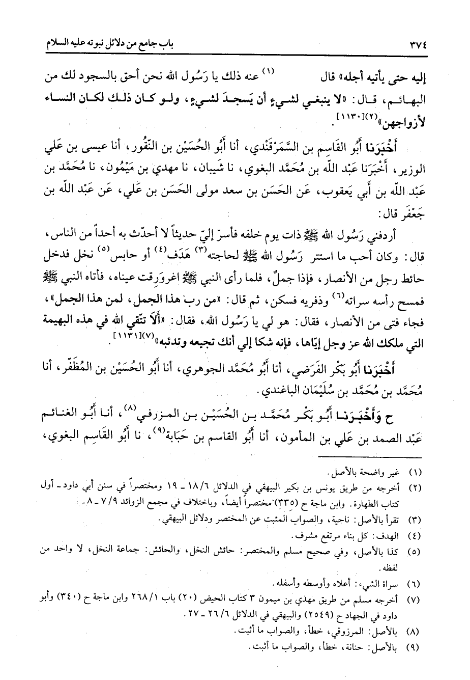 [1130] أخبرنا أبو القاسم بن السمرقندي أنا أبو الحسين بن النقور أنا عيسى بن علي الوزير أخبرنا عبد الله بن محمد البغوي نا شيبان نا مهدي بن ميمون نا محمد بن عبد الله بن أبي يعقوب عن الحسن بن سعد مولى الحسن بن علي عن عبد الله بن جعفر قال أردفني رسول الله (صلى الله عليه وسلم) ذات يوم خلفه فأسر إلي حديثا لا أحدث به أحدا من الناس قال وكان أحب ما استتر رسول الله (صلى الله عليه وسلم) لحاجته (3) هدف (4) أو حابس (5) نخل فدخل حائط رجل من الأنصار فإذا جمل فلما رأى النبي (صلى الله عليه وسلم) اغرورقت عيناه فأتاه النبي (صلى الله عليه وسلم) فمسح رأسه سراته (6) وذفريه فسكن ثم قال من رب هذا الجمل لمن هذا الجمل فجاء فتى من الأنصار فقال هو لي يا رسول الله فقال ألا تتقي الله في هذه البهيمة التي ملكك الله عز وجل إياها فإنه شكا إلي أنك تجيعه وتدئبه (7)