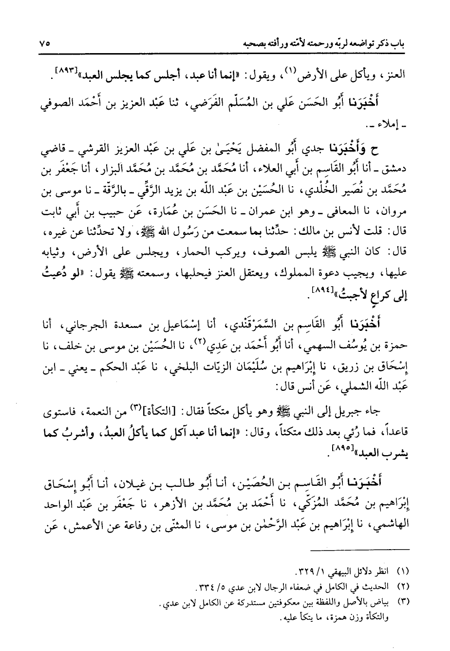 [894] أخبرنا أبو القاسم بن السمرقندي أنا إسماعيل بن مسعدة الجرجاني أنا حمزة بن يوسف السهمي أنا أبو أحمد بن عدي (2) نا الحسين بن موسى بن خلف نا إسحاق بن زريق نا إبراهيم بن سليمان الزيات البلخي نا عبد الحكم يعني ابن عبد الله الشملي عن أنس قال جاء جبريل إلى النبي (صلى الله عليه وسلم) وهو يأكل متكئا (3) فقال التكأة من النعمة فاستوى قاعدا فما رئى بعد ذلك متكئا وقالإنما أنا عبد آكل كما يأكل العبد وأشرب كما يشرب العبد