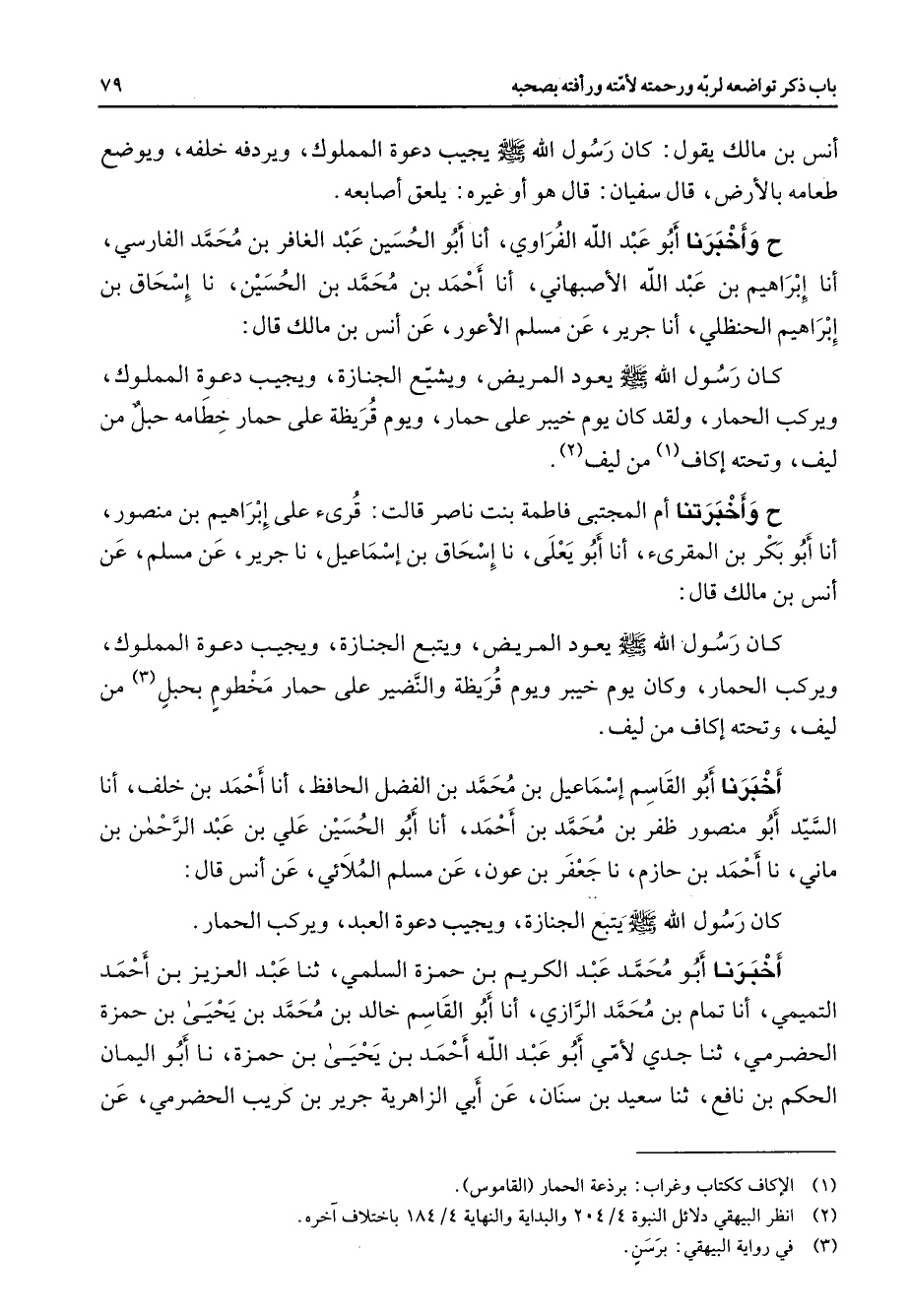 أنس بن مالك يقول كان رسول الله (صلى الله عليه وسلم) يجيب دعوة المملوك ويردفه خلفه ويوضع طعامه بالأرض قال سفيان قال هو أو غيره يلعق أصابعه ح وأخبرنا أبو عبد الله الفراوي أنا أبو الحسين عبد الغافر بن محمد الفارسي أنا إبراهيم بن عبد الله الأصبهاني أنا أحمد بن محمد بن الحسين نا إسحاق بن إبراهيم الحنظلي أنا جرير عن مسلم الأعور عن أنس بن مالك قال كان رسول الله (صلى الله عليه وسلم) يعود المريض ويشيع الجنازة ويجيب دعوة المملوك ويركب الحمار ولقد كان يوم خيبر على حمار ويوم قريظة على حمار خطامه حبل من ليف وتحته إكاف (1) من ليف (2) ح وأخبرتنا أم المجتبى فاطمة بنت ناصر قالت قرئ على إبراهيم بن منصور أنا أبو بكر بن المقرئ أنا أبو يعلى نا إسحاق بن إسماعيل نا جرير عن مسلم عن أنس بن مالك قال كان رسول الله (صلى الله عليه وسلم) يعود المريض ويتبع الجنازة ويجيب دعوة المملوك ويركب الحمار وكان يوم خيبر ويوم قريظة والنضير على حمار مخطوم بحبل (3) من ليف وتحته إكاف من ليف أخبرنا أبو القاسم إسماعيل بن محمد بن الفضل الحافظ أنا أحمد بن خلف أنا السيد أبو منصور ظفر بن محمد بن أحمد أنا أبو الحسين علي بن عبد الرحمن بن ماني نا أحمد بن حازم نا جعفر بن عون عن مسلم الملائي عن أنس قال كان رسول الله (صلى الله عليه وسلم) يتبع الجنازة ويجيب دعوة العبد ويركب الحمار أخبرنا أبو محمد عبد الكريم بن حمزة السلمي ثنا عبد العزيز بن أحمد التميمي أنا تمام بن محمد الرازي أنا أبو القاسم خالد بن محمد بن يحيى بن حمزة الحضرمي ثنا جدي لأمي أبو عبد الله أحمد بن يحيى بن حمزة نا أبو اليمان الحكم بن نافع ثنا سعيد بن سنان عن أبي الزاهرية جرير بن كريب الحضرمي عن