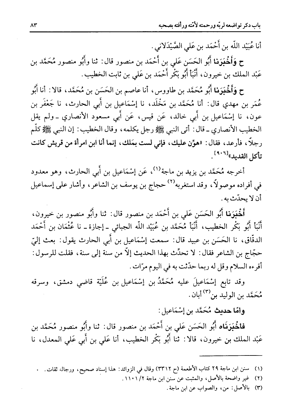 [906] أخرجه محمد بن يزيد بن ماجة (1) عن إسماعيل بن أبي الحارث وهو معدود في أفراده موصولا وقد استغربه (2) حجاج بن يوسف بن الشاعر وأشار على إسماعيل أن لا يحدث به أخبرنا أبو الحسن علي بن أحمد بن منصور قال ثنا وأبو منصور بن خيرون أنبأ أبو بكر الخطيب أنبأ محمد بن عبيد الله الجبائي إجازة نا عثمان بن أحمد الدقاق نا الحسن بن عبيد قال سمعت إسماعيل بن أبي الحارث يقول بعث إلي حجاج بن الشاعر فقال لا تحدث بهذا الحديث إلا من سنة إلى سنة فقلت للرسول أقرءه السلام وقل له ربما حدثت به في اليوم مرات وقد تابع إسماعيل عليه محمد بن إسماعيل بن علية قاضي دمشق وسرقه محمد بن الوليد بن (3) ابان وأما حديث محمد بن إسماعيل فأخبرناه أبو الحسن علي بن أحمد بن منصور قال ثنا وأبو منصور محمد بن عبد الملك بن خيرون قالا ثنا أبو بكر الخطيب أنا علي بن أبي علي المعدل نا
