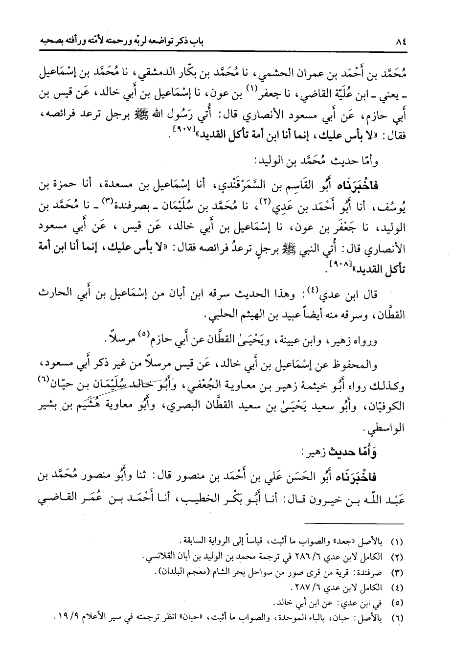 [907] وأما حديث محمد بن الوليد فأخبرناه أبو القاسم بن السمرقندي أنا إسماعيل بن مسعدة أنا حمزة بن يوسف أنا أبو أحمد بن عدي (2) نا محمد بن سليمان بصرفندة (3) نا محمد بن الوليد نا جعفر بن عون نا إسماعيل بن أبي خالد عن قيس عن أبي مسعود الأنصاري قال أتي النبي (صلى الله عليه وسلم) برجل ترعد فرائصه فقال لا بأس عليك إنما أنا ابن أمة تأكل القديد