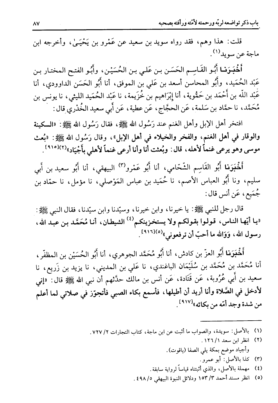 [915] أخبرنا أبو القاسم الشحامي أنا أبو عمرو (3) البيهقي أنا أبو سعيد بن أبي سليم ونا أبو العباس الأصم نا حميد بن عباس الموصلي نا مؤمل نا حماد بن جميع عن أنس قال قال رجل للنبي (صلى الله عليه وسلم) يا خيرنا وابن خيرنا وسيدنا وابن سيدنا فقال النبي (صلى الله عليه وسلم) يا أيها الناس قولوا بقولكم ولا يستخزينكم (4) الشيطان أنا محمد بن عبد الله رسول الله ووالله ما أحب أن ترفعوني (5)
