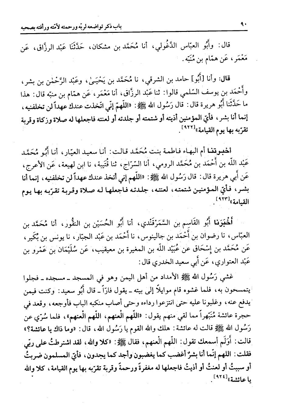 قال وأبو العباس الدغولي أنا محمد بن مشكان حدثنا عبد الرزاق عن معمر عن همام بن منبه قال وأنا أبو حامد بن الشرقي نا محمد بن يحيى وعبد الرحمن بن بشر وأحمد بن يوسف السلمي قالوا ثنا عبد الرزاق أنا معمر عن همام بن منبه قال هذا ما حدثنا أبو هريرة قال قال رسول الله (صلى الله عليه وسلم) اللهم إني اتخذت عندك عهدا لن تخلفينه إنما أنا بشر فأي المؤمنين أذيته أو شتمته أو جلدته أو لعنته فأجعلها له صلاة وزكاة وقربة تقربه بها يوم القيامة