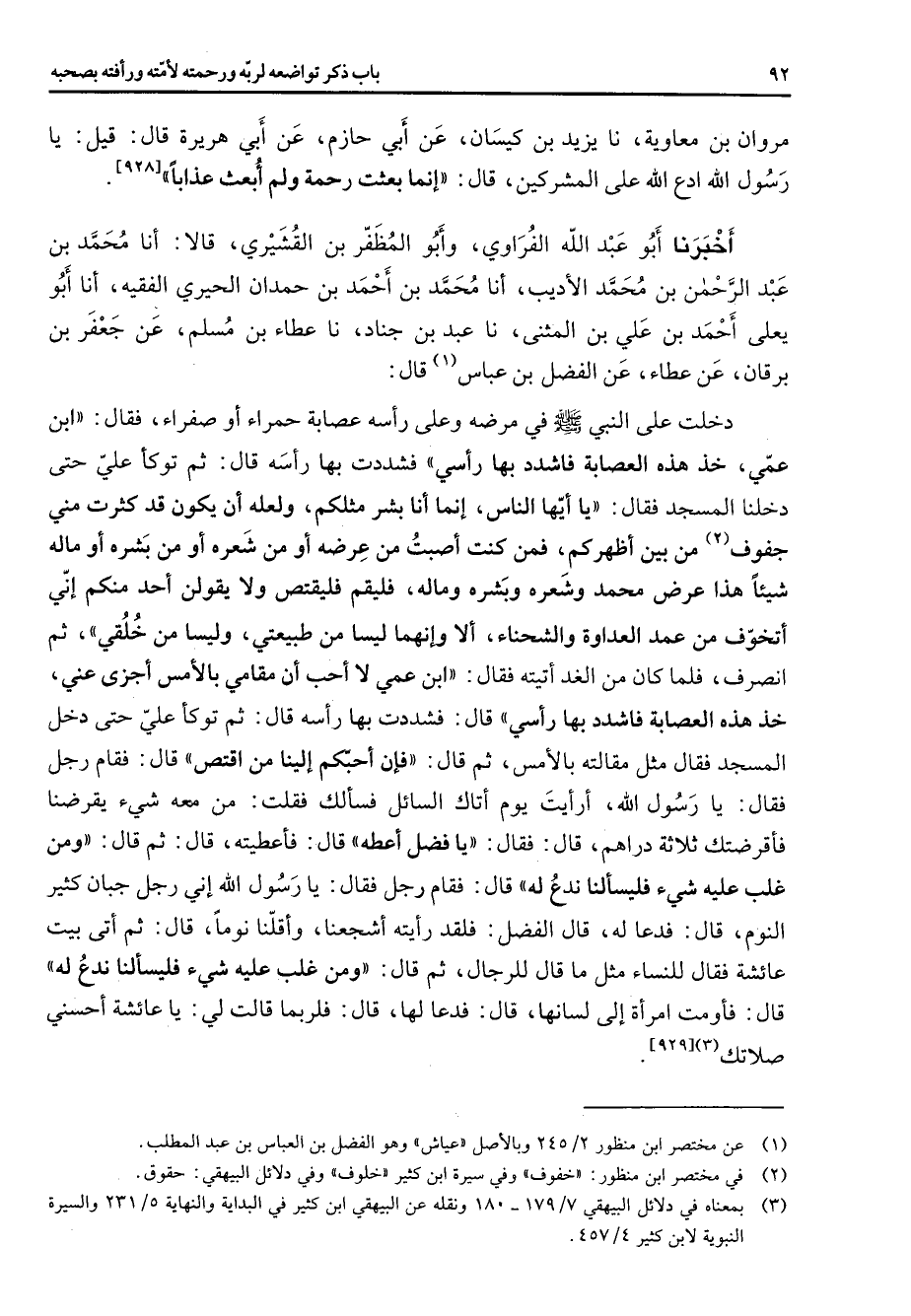 [928] أخبرنا أبو عبد الله الفراوي وأبو المظفر بن القشيري قالا أنا محمد بن عبد الرحمن بن محمد الأديب أنا محمد بن أحمد بن حمدان الحيري الفقيه أنا أبو يعلى أحمد بن علي بن المثنى نا عبد بن جناد نا عطاء بن مسلم عن جعفر بن برقان عن عطاء عن الفضل بن عباس (1) قال دخلت على النبي (صلى الله عليه وسلم) في مرضه وعلى رأسه عصابة حمراء أو صفراء فقال ابن عمي خذ هذه العصابة فأشدد بها رأسي فشددت بها رأسه قال ثم توكأ علي حتى دخلنا المسجد فقال يا أيها الناس إنما أنا بشر مثلكم ولعله أن يكون قد كثرت مني جفوف (2) من بين أظهركم فمن كنت أصبت من عرضه أو من شعره أو من بشره أو ماله شيئا هذا عرض محمد وشعره وبشره وماله فليقم فليقتص ولا يقولن أحد منكم إني أتخوف من عمد العدواة والشحناء ألا وإنهما ليسا من طبيعتي وليسا من خلقي ثم انصرف فلما كان من الغد أتيته فقال ابن عمي لا أحب أن مقامي بالأمس أجزى عني خذ هذه العصابة فأشدد بها رأسي قال فشددت بها رأسه قال ثم توكأ علي حتى دخل المسجد فقال مثل مقالته بالأمس ثم قال فإن أحبكم إلينا من اقتص قال فقام رجل فقال يا رسول الله أرأيت يوم أتاك السائل فسألك فقلت من معه شئ يقرضنا فأقرضتك ثلاثة دراهم قال فقال يا فضل أعطه قال فأعطيته قال ثم قال ومن غلب عليه شئ فليسألنا ندع له قال فقام رجل فقال يا رسول الله إني رجل جبان كثير النوم قال فدعا له قال الفضل فلقد رأيته أشجعنا وأقلنا نوما قال ثم أتى بيت عائشة فقال للنساء مثل ما قال للرجال ثم قال ومن غلب عليه شئ فليسألنا ندع له قال فأومت امرأة إلى لسانها قال فدعا لها قال فلربما قالت لي يا عائشة أحسني صلاتك (3)