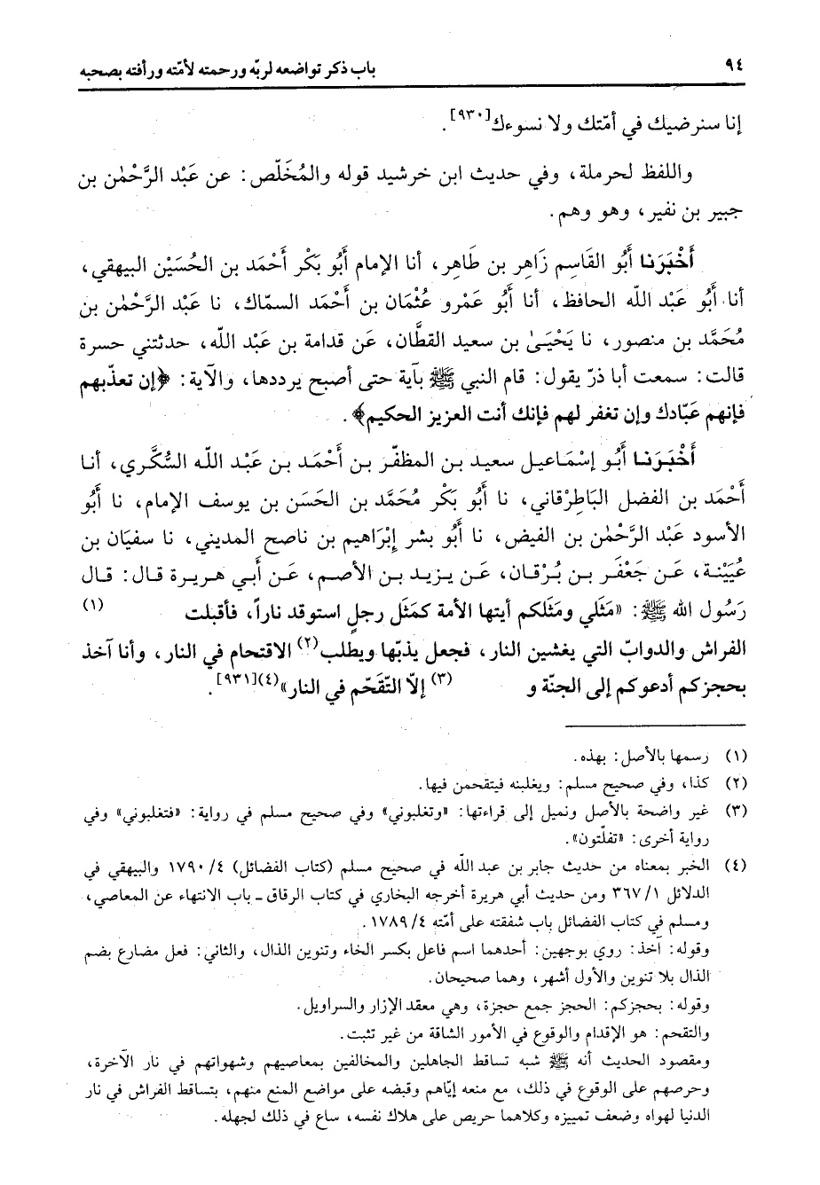 إنا سنرضيك في أمتك ولا نسوءك واللفظ لحرملة وفي حديث ابن خرشيد قوله والمخلص عن عبد الرحمن بن جبير بن نفير وهو وهم أخبرنا أبو القاسم زاهر بن طاهر أنا الإمام أبو بكر أحمد بن الحسين البيهقي أنا أبو عبد الله الحافظ أنا أبو عمرو عثمان بن أحمد السماك نا عبد الرحمن بن محمد بن منصور نا يحيى بن سعيد القطان عن قدامة بن عبد الله حدثتني حسرة قالت سمعت أبا ذر يقول قام النبي (صلى الله عليه وسلم) بآية حتى أصبح يرددها والآية " إن تعذبهم فإنهم عبادك وإن تغفر لهم فإنك أنت العزيز الحكيم " أخبرنا أبو إسماعيل سعيد بن المظفر بن أحمد بن عبد الله السكري أنا أحمد بن الفضل الباطرقاني نا أبو بكر محمد بن الحسن بن يوسف الإمام نا أبو الأسود عبد الرحمن بن الفيض نا أبو بشر إبراهيم بن ناصح المديني نا سفيان بن عيينة عن جعفر بن برقان عن يزيد الأصم عن أبي هريرة قال قال رسول الله (صلى الله عليه وسلم) مثلي ومثلكم أيتها الأمة كمثل رجل استوقد نارا فأقبلت (1) الفراش والدواب التي يغشين النار فجعل يذبها ويطلب (2) الاقتحام في النار وأنا آخذ بحجزكم أدعوكم إلى الجنة و (3) إلا التقحم في النار