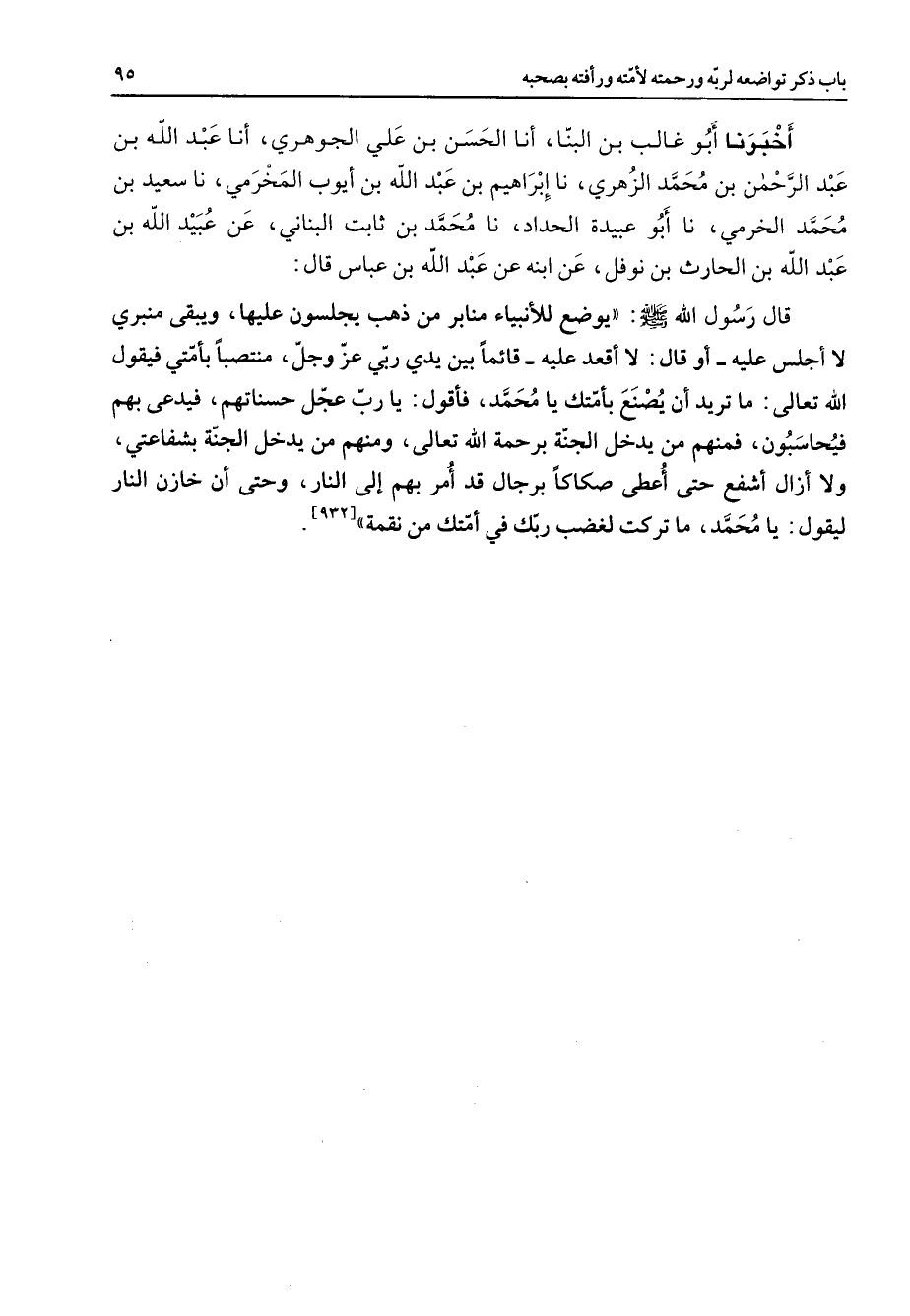 أخبرنا أبو غالب بن البنا أنا الحسن بن علي الجوهري أنا عبد الله بن عبد الرحمن بن محمد الزهري نا إبراهيم بن عبد الله بن أيوب المخرمي نا سعيد بن محمد الخرمي نا أبو عبيدة الحداد نا محمد بن ثابت البناني عن عبيد الله بن عبد الله بن الحارث بن نوفل عن ابنه عن عبد الله بن عباس قال قال رسول الله (صلى الله عليه وسلم) يوضع للأنبياء منابر من ذهب يجلسون عليها ويبقى منبري لا أجلس عليه أو قال لا أقعد عليه قائما بين يدي ربي عز وجل منتصبا بأمتي فيقول الله تعالى ما تريد أن يصنع بأمتك يا محمد فأقول يا رب عجل حسناتهم فيدعى بهم فيحاسبون فمنهم من يدخل الجنة برحمة الله تعالى ومنهم من يدخل الجنة بشفاعتي ولا أزال أشفع حتى أعطى صكاكا برجال قد أمر بهم إلى النار وحتى أن خازن النار ليقول يا محمد ما تركت لغضب ربك في أمتك من نقمة