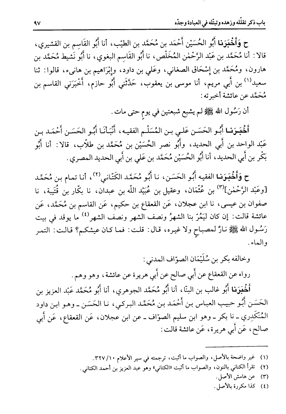 ح وأخبرنا أبو الحسين أحمد بن محمد بن الطيب أنا أبو القاسم بن القشيري قالا أنا محمد بن عبد الرحمن المخلص نا أبو القاسم البغوي نا أبو نشيط محمد بن هارون ومحمد بن إسحاق الصغاني وعلي بن داود وإبراهيم بن هانئ قالوا ثنا سعيد (1) بن أبي مريم أنا موسى بن يعقوب حدثني أبو حازم أخبرني القاسم بن محمد عن عائشة أخبرته أن رسول الله (صلى الله عليه وسلم) لم يشبع شبعتين في يوم حتى مات أخبرنا أبو الحسن علي بن المسلم الفقيه أنبأنا أبو الحسن أحمد بن عبد الواحد بن أبي الحديد وأبو نصر الحسين بن محمد بن طلاب قالا أنا أبو بكر بن أبي الحديد أنا أبو الحسين محمد بن علي بن أبي الحديد المصري ح وأخبرنا الفقيه أبو الحسن نا أبو محمد الكتاني (2) أنا تمام بن محمد وعبد الرحمن (3) بن عثمان وعقيل بن عبيد الله بن عبدان نا بكار بن قتيبة نا صفوان بن عيسى نا ابن عجلان عن القعقاع بن حكيم عن القاسم بن محمد عن عائشة قالت إن كان ليمر بنا الشهر ونصف الشهر ونصف الشهر (4) ما يوقد في بيت رسول الله (صلى الله عليه وسلم) نار لمصباح ولا غيره قال قلت فما كان عيشكم قالت التمر والماء وخالفه بكر بن سليمان الصواف المدني رواه عن القعقاع عن أبي صالح عن أبي هريرة عن عائشة وهو وهم أخبرنا أبو غالب بن البنا أنا أبو محمد الجوهري أنا أبو محمد عبد العزيز بن الحسن أبو حبيب العباس بن أحمد بن محمد البركي نا الحسن وهو ابن داود المنكدري نا بكر وهو ابن سليم الصواف عن ابن عجلان عن القعقاع عن أبي صالح عن أبي هريرة عن عائشة قالت