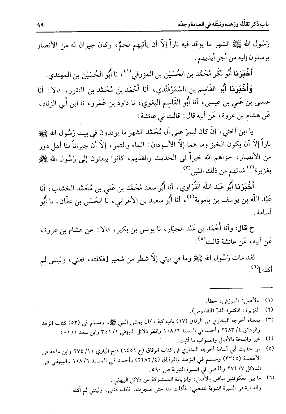 (5) من حديث أبي أسامة وأخرجه البخاري في كتاب الرقاق (ح 6451) فتح الباري 11 / 274 وابن ماجة في الاطعمة (3345) ومسلم في الزهد والرقاق (4 / 2282) وأحمد في المسند 6 / 108 والبيهقي في الدلائل 7 / 274 والذهبي في السيرة النبوية ص 590