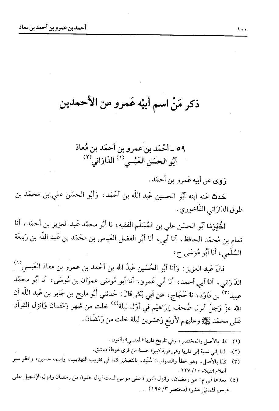 59 - أحمد بن عمرو بن أحمد بن معاذ أبو الحسن العبسي (1) الداراني (2) روى عن أبيه عمرو بن أحمد حدث عنه ابنه أبو الحسين عبد الله بن أحمد وأبو الحسن علي بن محمد بن طوق الداراني الفاخوري أخبرنا أبو الحسن علي بن المسلم الفقيه نا أبو محمد عبد العزيز بن أحمد أنا تمام بن محمد الحافظ أنا أبي أنا أبو الفضل العباس بن محمد بن عبد الله بن ربيعة السلمي أنا أبو موسى قال عبد العزيز وأنا أبو الحسين عبد الله بن أحمد بن عمرو بن معاذ العبسي (1) الداراني أنا أبي أحمد أنا أبي عمرو أنا أبو موسى عمران بن موسى أنا أبو محمد عبيد (3) بن داود نا حجاج عن أبي بكر قال حدثني أبو مليح بن جابر بن عبد الله أن الله عز وجل أنزل صحف إبراهيم في أول ليلة (4) خلت من شهر رمضان وأنزل القرآن على محمد (صلى الله عليه وسلم) وعليهم لأربع وعشرين ليلة خلت من رمضان