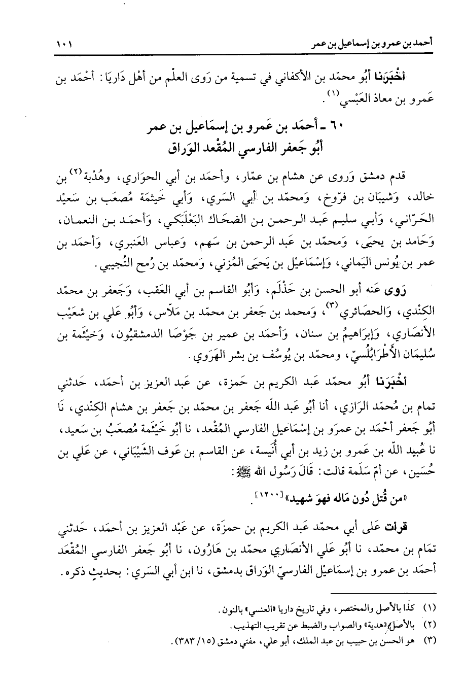 60 - أحمد بن عمرو بن إسماعيل بن عمر أبو جعفر الفارسي المقعد الوراق قدم دمشق وروى عن هشام بن عمار وأحمد بن أبي الحواري وهدبة (2) بن خالد وشيبان بن فروخ ومحمد بن أبي السري وأبي خيثمة مصعب بن سعيد الحراني وأبي سليم عبد الرحمن بن الضحاك البعلبكي وأحمد بن النعمان وحامد بن يحيى ومحمد بن عبد الرحمن بن سهم وعباس العنبري وأحمد بن عمر بن يونس اليماني وإسماعيل بن يحيى المزني ومحمد بن رمح التجيبي روى عنه أبو الحسن بن حذلم وأبو القاسم بن أبي العقب وجعفر بن محمد الكندي والحصائري (3) ومحمد بن جعفر بن محمد بن ملاس وأبو علي بن شعيب الأنصاري وإبراهيم بن سنان وأحمد بن عمير بن جوصا الدمشقيون وخيثمة بن سليمان الأطرابلسي ومحمد بن يوسف بن بشر الهروي أخبرنا أبو محمد عبد الكريم بن حمزة عن عبد العزيز بن أحمد حدثني تمام بن محمد الرازي أنا أبو عبد الله جعفر بن محمد بن جعفر بن هشام الكندي نا أبو جعفر أحمد بن عمرو بن إسماعيل الفارسي المقعد نا أبو خيثمة مصعب بن سعيد نا عبيد الله بن عمرو بن زيد بن ابي أنيسة عن القاسم بن عوف الشيباني عن علي بن حسين عن أم سلمة قالت قال رسول الله (صلى الله عليه وسلم) من قتل دون ماله فهو شهيد قرأت على أبي محمد عبد الكريم بن حمزة عن عبد العزيز بن أحمد حدثني تمام بن محمد نا أبو علي الأنصاري محمد بن هارون نا أبو جعفر الفارسي المقعد أحمد بن عمرو بن إسماعيل الفارسي الوراق بدمشق نا ابن ابي السري بحديث ذكره