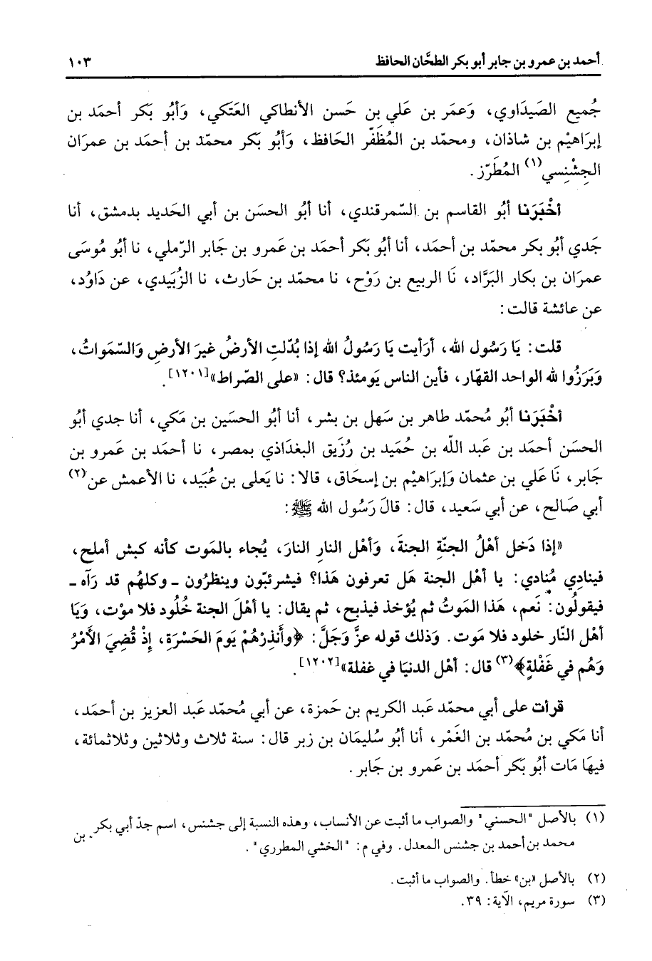 جميع الصيداوي وعمر بن علي بن حسن الأنطاكي العتكي وأبو بكر أحمد بن إبراهيم بن شاذان ومحمد بن المظفر الحافظ وأبو بكر محمد بن أحمد بن عمران الجشنسي (1) المطرز أخبرنا أبو القاسم بن السمرقندي أنا أبو الحسن بن أبي الحديد بدمشق أنا جدي أبو بكر محمد بن أحمد أنا أبو بكر أحمد بن عمرو بن جابر الرملي نا أبو موسى عمران بن بكار البراد نا الربيع بن روح نا محمد بن حارث نا الزبيدي عن داود عن عائشة قالت قلت يا رسول الله أرأيت يا رسول الله إذا بدلت الأرض غير الأرض والسموات وبرزوا لله الواحد القهار فأين الناس يومئذ قال على الصراط أخبرنا أبو محمد طاهر بن سهل بن بشر أنا أبو الحسين بن مكي أنا جدي أبو الحسن أحمد بن عبد الله بن حميد بن رزيق البغداذي بمصر نا أحمد بن عمرو بن جابر نا علي بن عثمان وإبراهيم بن إسحاق قالا نا يعلى بن عبيد نا الأعمش عن (2) أبي صالح عن أبي سعيد قال قال رسول الله (صلى الله عليه وسلم) إذا دخل أهل الجنة الجنة وأهل النار النار يجاء بالموت كأنه كبش أملح فينادي منادي يا أهل الجنة هل تعرفون هذا فيشرئبون وينظرون وكلهم قد رآه فيقولون نعم هذا الموت ثم يؤخذ فيذبح ثم يقال يا أهل الجنة خلود فلا موت ويا أهل النار خلود فلا موت وذلك قوله عز وجل " وأنذرهم يوم الحسرة إذ قضي الأمر وهم في غفلة " (3) قال أهل الدنيا في غفلة قرأت على أبي محمد عبد الكريم بن حمزة عن أبي محمد عبد العزيز بن أحمد أنا مكي بن محمد بن الغمر أنا أبو سليمان بن زبر قال سنة ثلاث وثلاثين وثلاثمائة فيها مات أبو بكر أحمد بن عمرو بن جابر