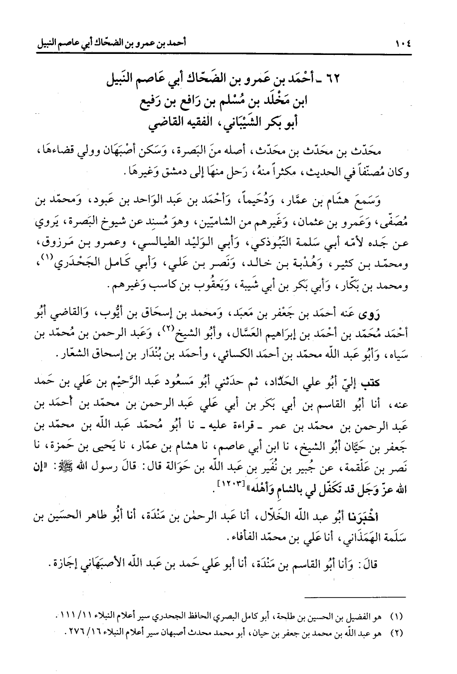 62 - أحمد بن عمرو بن الضحاك أبي عاصم النبيل ابن مخلد بن مسلم بن رافع بن رفيع أبو بكر الشيباني الفقيه القاضي محدث بن محدث بن محدث أصله من البصرة وسكن أصبهان وولي قضاءها وكان مصنفا في الحديث مكثرا منه رحل منها إلى دمشق وغيرها وسمع هشام بن عمار ودحيما وأحمد بن عبد الواحد بن عبود ومحمد بن مصفى وعمرو بن عثمان وغيرهم من الشاميين وهو مسند عن شيوخ البصرة يروي عن جده لأمه أبي سلمة التبوذكي وابي الوليد الطيالسي وعمرو بن مرزوق ومحمد بن كثير وهدبة بن خالد ونصر بن علي وأبي كامل الجحدري (1) ومحمد بن بكار وأبي بكر بن أبي شيبة ويعقوب بن كاسب وغيرهم روى عنه أحمد بن جعفر بن معبد ومحمد بن إسحاق بن أيوب والقاضي أبو أحمد محمد بن أحمد بن إبراهيم العسال وأبو الشيخ (2) وعبد الرحمن بن محمد بن سياه وأبو عبد الله محمد بن أحمد الكسائي وأحمد بن بندار بن إسحاق الشعار كتب إلي أبو علي الحداد ثم حدثني أبو مسعود عبد الرحيم بن علي بن حمد عنه أنا أبو القاسم بن أبي بكر بن أبي علي عبد الرحمن بن محمد بن أحمد بن عبد الرحمن بن محمد بن عمر قراءة عليه نا أبو محمد عبد الله بن محمد بن جعفر بن حيان أبو الشيخ نا ابن أبي عاصم نا هشام بن عمار نا يحيى بن حمزة نا نصر بن علقمة عن جبير بن نفير بن عبد الله بن حوالة قال قال رسول الله (صلى الله عليه وسلم) إن الله عز وجل قد تكفل لي بالشام وأهله أخبرنا أبو عبد الله الخلال أنا عبد الرحمن بن مندة أنا أبو طاهر الحسين بن سلمة الهمذاني أنا علي بن محمد الفأفاء قال وأنا أبو القاسم بن مندة أنا أبو علي حمد بن عبد الله الأصبهاني إجازة