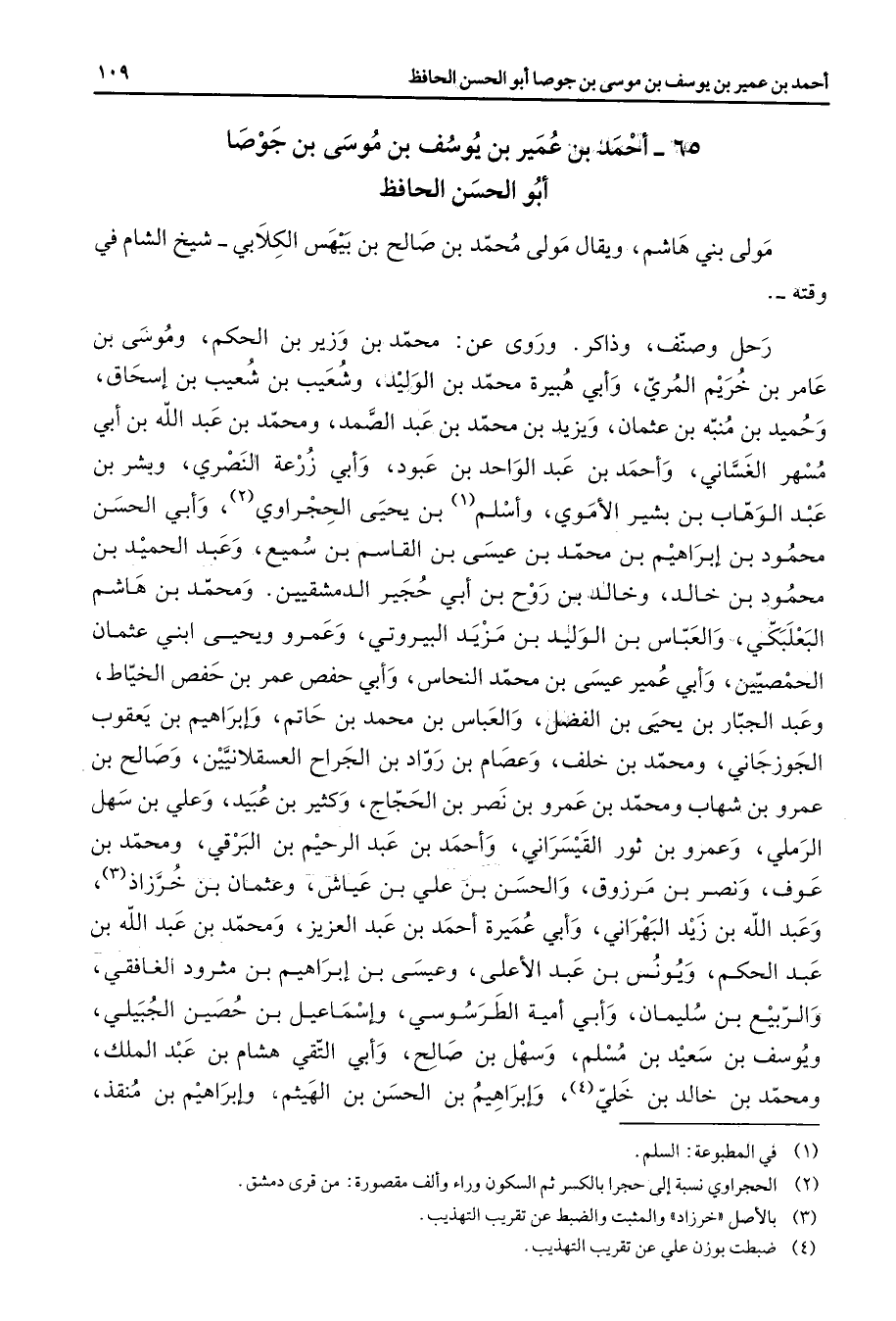 65 - أحمد بن عمير بن يوسف بن موسى بن جوصا أبو الحسن الحافظ مولى بني هاشم ويقال مولى محمد بن صالح بن بيهس الكلابي شيخ الشام في وقته رحل وصنف وذاكر وروى عن محمد بن وزير بن الحكم وموسى بن عامر بن خريم المري وأبي هبيرة محمد بن الوليد وشعيب بن شعيب بن إسحاق وحميد بن منبه بن عثمان ويزيد بن محمد بن عبد الصمد ومحمد بن عبد الله بن أبي مسهر الغساني وأحمد بن عبد الواحد بن عبود وأبي زرعة النصري وبشر بن عبد الوهاب بن بشير الأموي وأسلم (1) بن يحيى الحجراوي (2) وأبي الحسن محمود بن إبراهيم بن محمد بن عيسى بن القاسم بن سميع وعبد الحميد بن محمود بن خالد وخالد بن روح بن أبي حجير الدمشقيين ومحمد بن هاشم البعلبكي والعباس بن الوليد بن مزيد البيروتي وعمرو ويحيى ابني عثمان الحمصيين وأبي عمير عيسى بن محمد النحاس وأبي حفص عمر بن حفص الخياط وعبد الجبار بن يحيى بن الفضل والعباس بن محمد بن حاتم وإبراهيم بن يعقوب الجوزجاني ومحمد بن خلف وعصام بن رواد بن الجراح العسقلانيين وصالح بن عمرو بن شهاب ومحمد بن عمرو بن نصر بن الحجاج وكثير بن عبيد وعلي بن سهل الرملي وعمرو بن ثور القيسراني وأحمد بن عبد الرحيم بن البرقي ومحمد بن عوف ونصر بن مرزوق والحسن بن علي بن عياش وعثمان بن خرزاذ (3) وعبد الله بن زيد البهراني وأبي عميرة أحمد بن عبد العزيز ومحمد بن عبد الله بن عبد الحكم ويونس بن عبد الأعلى وعيسى بن إبراهيم بن مثرود الغافقي والربيع بن سليمان وأبي أمية الطرسوسي وإسماعيل بن حصين الجبيلي ويوسف بن سعيد بن مسلم وسهل بن صالح وأبي التقي هشام بن عبد الملك ومحمد بن خالد بن خلي (4) وإبراهيم بن الحسن بن الهيثم وإبراهيم بن منقذ