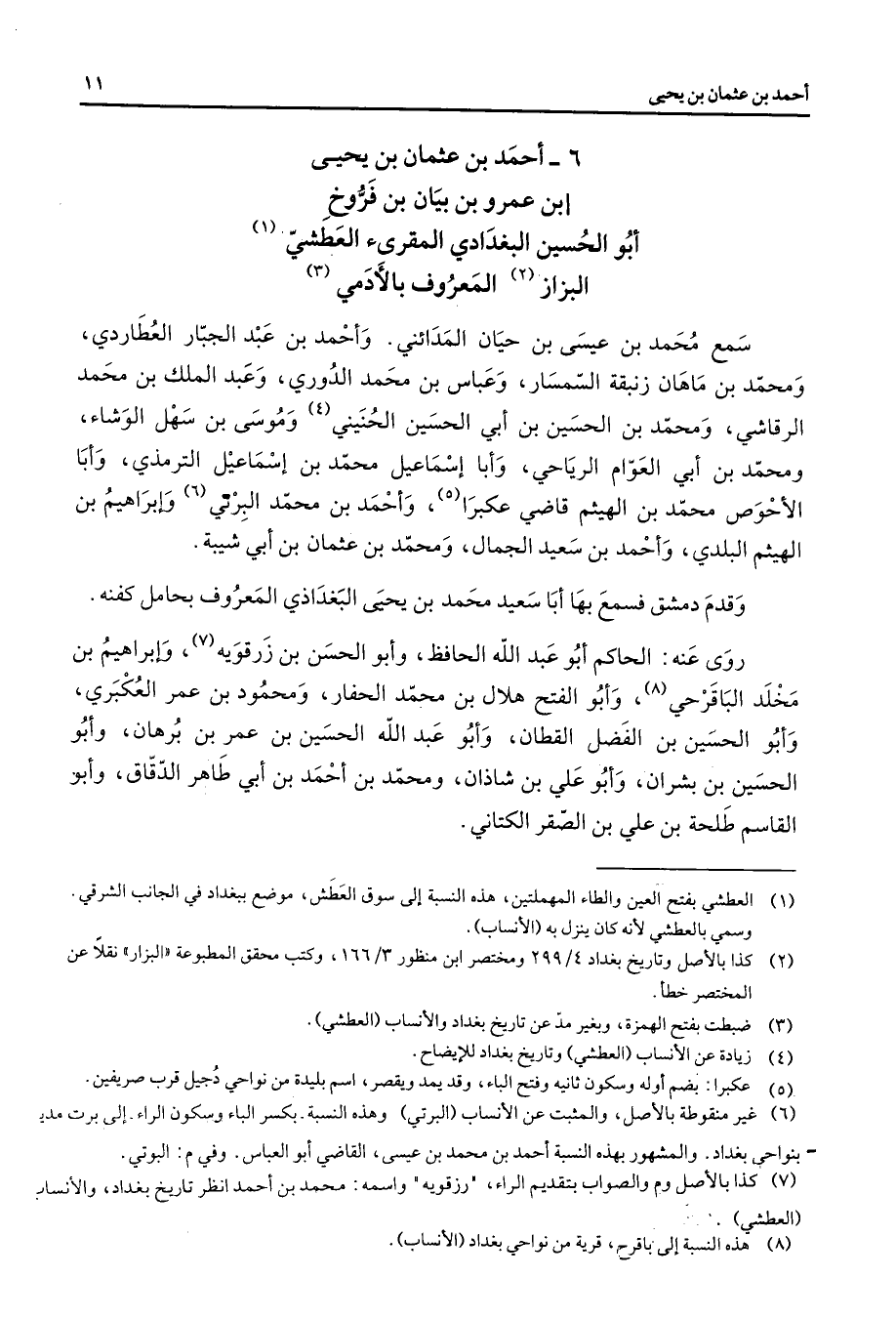 6 - أحمد بن عثمان بن بحيى ابن عمرو بن بيان بن فروخ أبو الحسين البغدادي المقرئ العطشي (1) البزاز (2) المعروف بالأدمي (3) سمع محمد بن عيسى بن حيان المدائني وأحمد بن عبد الجبار العطاردي ومحمد بن ماهان زنبقة السمسار وعباس بن محمد الدوري وعبد الملك بن محمد الرقاشي ومحمد بن الحسين بن أبي الحسين الحنيني (4) وموسى بن سهل الوشاء ومحمد بن أبي العوام الرياحي وأبا إسماعيل محمد بن إسماعيل الترمذي وأبا الأحوص محمد بن الهيثم قاضي عكبرا (5) وأحمد بن محمد البرتي (6) وإبراهيم بن الهيثم البلدي وأحمد بن سعيد الجمال ومحمد بن عثمان بن أبي شيبة وقدم دمشق فسمع بها أبا سعيد محمد بن يحيى البغدادي المعروف بحامل كفنه روى عنه الحاكم أبو عبد الله الحافظ وأبو الحسن بن زرقويه (7) وإبراهيم بن مخلد الباقرحي (8) وأبو الفتح هلال بن محمد الحفار ومحمود بن عمر العكبري وأبو الحسين بن الفضل القطان وأبو عبد الله الحسين بن عمر بن برهان وأبو الحسين بن بشران وأبو علي بن شاذان ومحمد بن أحمد بن أبي طاهر الدقاق وأبو القاسم طلحة بن علي بن الصقر الكتاني