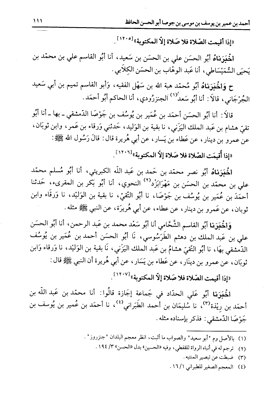 إذا أقيمت الصلاة فلا صلاة إلا المكتوبة أخبرناه أبو الحسن علي بن الحسن بن سعيد أنا أبو القاسم علي بن محمد بن يحيى السميساطي أنا عبد الوهاب بن الحسن الكلابي ح وأخبرناه أبو محمد هبة الله بن سهل الفقيه وأبو القاسم تميم بن أبي سعيد الجرجاني قالا أنا أبو سعد (1) الجنزرودي أنا الحاكم أبو أحمد قالا أنا أبو الحسن أحمد بن عمير بن يوسف بن جوصا الدمشقي بها أنا أبو تقي هشام بن عبد الملك اليزني نا بقية بن الوليد حدثني ورقاء بن عمر وابن ثوبان عن عمرو بن دينار عن عطاء بن يسار عن أبي هريرة قال قال رسول الله (صلى الله عليه وسلم) إذا أقيمت الصلاة فلا صلاة إلا المكتوبة أخبرناه أبو نصر محمد بن حمد بن عبد الله الكبريتي أنا أبو مسلم محمد علي بن محمد بن الحسن بن مهرابزد (2) النحوي أنا أبو بكر بن المقرئ حدثنا أحمد بن عمير بن يوسف بن جوصا نا أبو التقي نا بقية بن الوليد نا ورقاء وابن ثوبان عن عمرو بن دينار عن عطاء عن أبي هريرة عن النبي (صلى الله عليه وسلم) مثله وأخبرنا أبو القاسم الشحامي أنا أبو سعد محمد بن عبد الرحمن أنا أبو الحسن علي بن عبد الملك بن دهثم الطرسوسي نا أبو الحسن أحمد بن عمير بن يوسف الدمشقي بها نا أبو التقي هشام بن عبد الملك اليزني نا بقية بن الوليد نا ورقاء وابن ثوبان عن عمرو بن دينار عن عطاء بن يسار عن أبي هريرة أن النبي (صلى الله عليه وسلم) قال إذا أقيمت الصلاة فلا صلاة إلا المكتوبة أخبرنا أبو علي الحداد في جماعة إجازة قالوا أنا محمد بن عبد الله بن أحمد بن ريذة (3) نا سليمان بن أحمد الطبراني (4) نا أحمد بن عمير بن يوسف بن جوصا الدمشقي فذكر بإسناده مثله