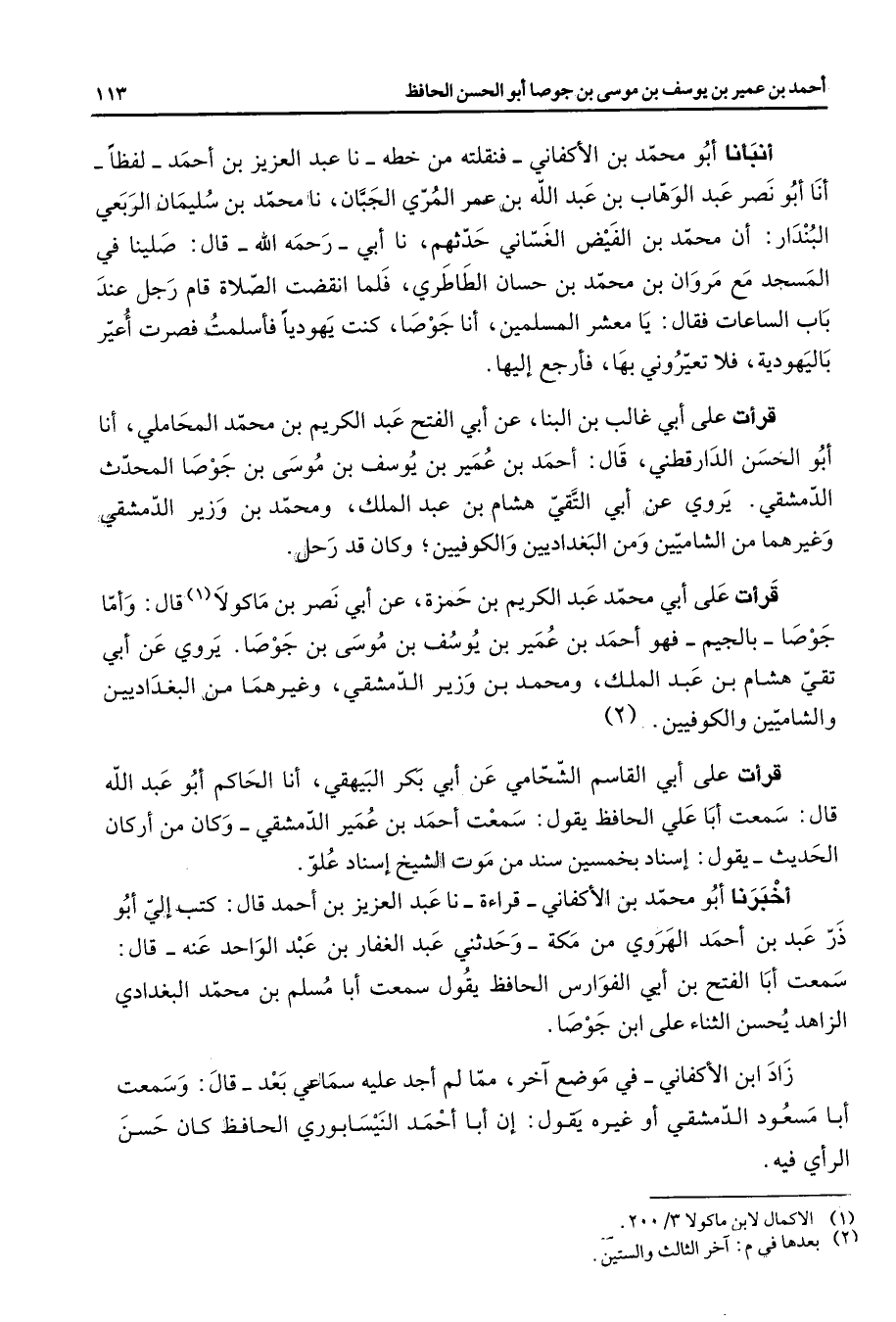 أنبأنا أبو محمد بن الأكفاني فنقلته من خطه نا عبد العزيز بن أحمد لفظا أنا أبو نصر عبد الوهاب بن عبد الله بن عمر المري الجبان نا محمد بن سليمان الربعي البندار أن محمد بن الفيض الغساني حدثهم نا أبي رحمه الله قال صلينا في المسجد مع مروان بن محمد بن حسان الطاطري فلما انقضت الصلاة قام رجل عند باب الساعات فقال يا معشر المسلمين أنا جوصا كنت يهوديا فأسلمت فصرت أعير باليهودية فلا تعيروني بها فأرجع إليها قرأت على أبي غالب بن البنا عن أبي الفتح عبد الكريم بن محمد المحاملي أنا أبو الحسن الدارقطني قال أحمد بن عمير بن يوسف بن موسى بن جوصا المحدث الدمشقي يروي عن أبي التقي هشام بن عبد الملك ومحمد بن وزير الدمشقي وغيرهما من الشاميين ومن البغداديين والكوفيين وكان قد رحل قرأت على أبي محمد عبد الكريم بن حمزة عن ابي نصر بن ماكولا (1) قال وأما جوصا بالجيم فهو أحمد بن عمير بن يوسف بن موسى بن جوصا يروي عن أبي تقي هشام بن عبد الملك ومحمد بن وزير الدمشقي وغيرهما من البغداديين والشاميين والكوفيين (2) قرأت على أبي القاسم الشحامي عن أبي بكر البيهقي أنا الحاكم أبو عبد الله قال سمعت أبا علي الحافظ يقول سمعت أحمد بن عمير الدمشقي وكان من أركان الحديث يقول إسناد بخمسين سند من موت الشيخ إسناد علو أخبرنا أبو محمد بن الأكفاني قراءة نا عبد العزيز بن أحمد قال كتب إلى أبو ذر عبد بن أحمد الهروي من مكة وحدثني عبد الغفار بن عبد الواحد عنه قال سمعت أبا الفتح بن ابي الفوارس الحافظ يقول سمعت أبا مسلم بن محمد البغدادي الزاهد يحسن الثناء على ابن جوصا زاد ابن الأكفاني في موضع آخر مما لم أجد عليه سماعي بعد قال وسمعت أبا مسعود الدمشقي أو غيره يقول إن أبا أحمد النيسابوري الحافظ كان حسن الرأي فيه