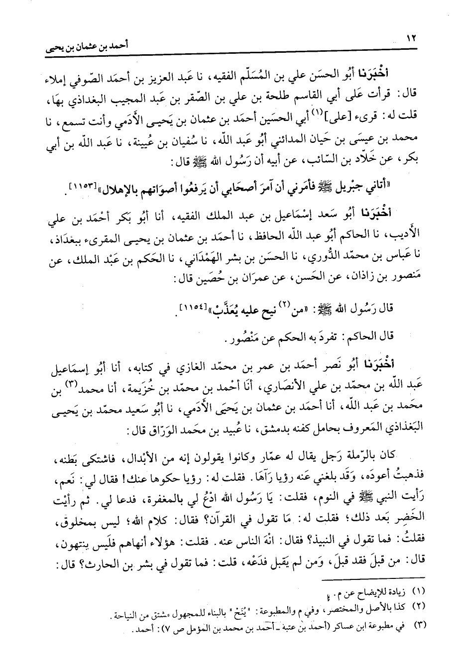 [1154] قال الحاكم تفرد به الحكم عن منصور أخبرنا أبو نصر أحمد بن عمر بن محمد الغازي في كتابه أنا أبو إسماعيل عبد الله بن محمد بن علي الأنصاري أنا أحمد بن محمد بن خزيمة أنا محمد (3) بن محمد بن عبد الله أنا أحمد بن عثمان بن يحيى الأدمي نا أبو سعيد محمد بن يحيى البغذاذي المعروف بحامل كفنه بدمشق نا عبيد بن محمد الوراق قال كان بالرملة رجل يقال له عمار وكانوا يقولون إنه من الأبدال فاشتكى بطنه فذهبت أعوده وقد بلغني عنه رؤيا رآها فقلت له رؤيا حكوها عنك فقال لي نعم رأيت النبي (صلى الله عليه وسلم) في النوم فقلت يا رسول الله ادع لي بالمغفرة فدعا لي ثم رأيت الخضر بعد ذلك فقلت له ما تقول في القرآن فقال كلام الله ليس بمخلوق فقلت فما تقول في النبيذ فقال انه الناس عنه فقلت هؤلاء أنهاهم فليس ينتهون قال من قبل فقد قبل ومن لم يقبل فدعه قلت فما تقول في بشر بن الحارث