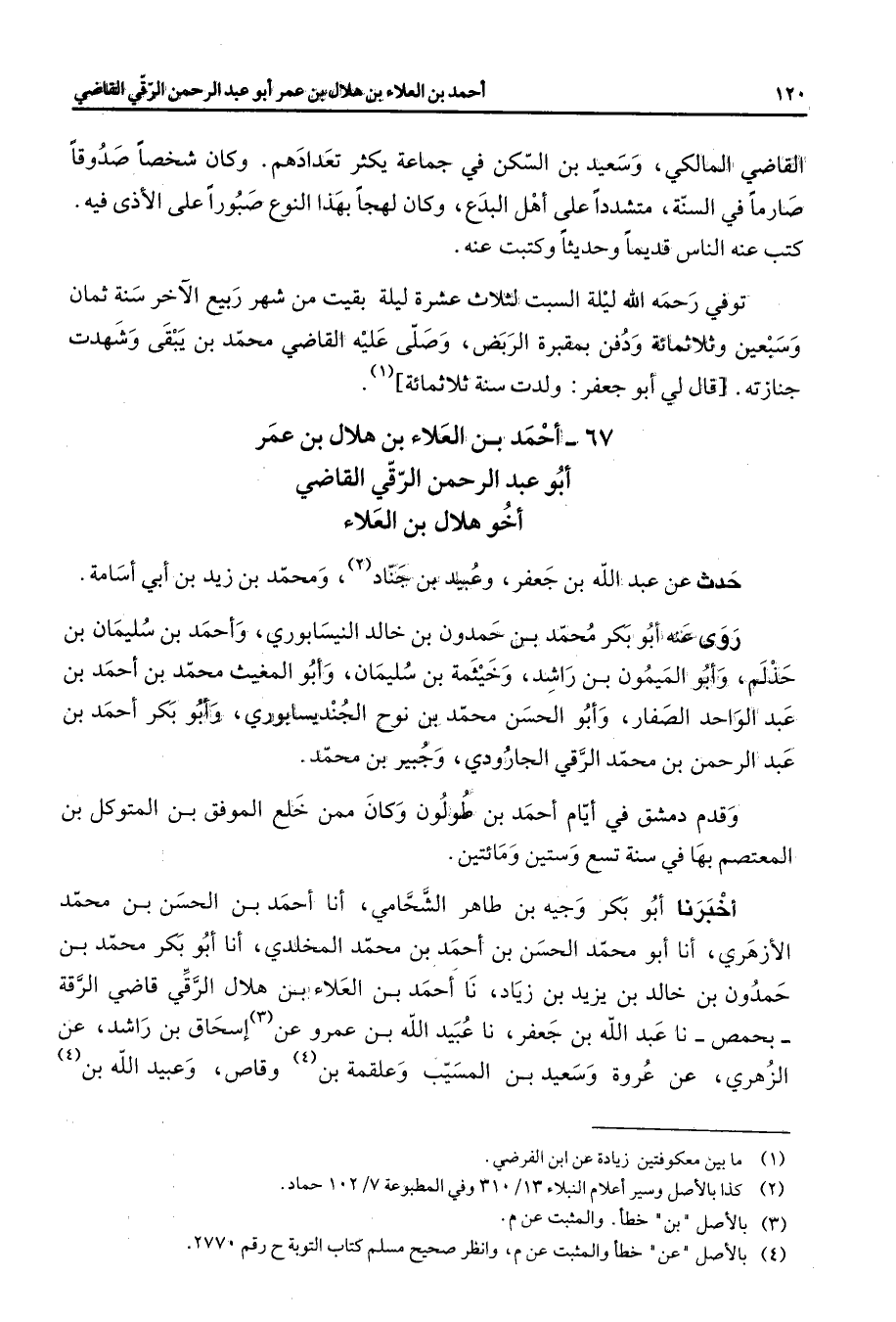 67 - أحمد بن العلاء بن هلال بن عمر أبو عبد الرحمن الرقي القاضي أخو هلال بن العلاء حدث عن عبد الله بن جعفر وعبيد بن جناد (2) ومحمد بن زيد بن أبي أسامة روى عنه أبو بكر محمد بن حمدون بن خالد النيسابوري وأحمد بن سليمان بن حذلم وأبو الميمون بن راشد وخيثمة بن سليمان وأبو المغيث محمد بن أحمد بن عبد الواحد الصفار وابو الحسن محمد بن نوح الجنديسابوري وأبو بكر أحمد بن عبد الرحمن بن محمد الرقي الجارودي وجبير بن محمد وقدم دمشق في أيام أحمد بن طولون وكان ممن خلع الموفق بن المتوكل بن المعتصم بها في سنة تسع وستين ومائتين أخبرنا أبو بكر وجيه بن طاهر الشحامي أنا أحمد بن الحسن بن محمد الأزهري أنا أبو محمد الحسن بن أحمد بن محمد المخلدي أنا أبو بكر محمد بن حمدون بن خالد بن يزيد بن زياد نا أحمد بن العلاء بن هلال الرقي قاضي الرقة بحمص نا عبد الله بن جعفر نا عبيد الله بن عمرو عن (3) إسحاق بن راشد عن الزهري عن عروة وسعيد بن المسيب وعلقمة بن (4) وقاص وعبيد الله بن (4)
